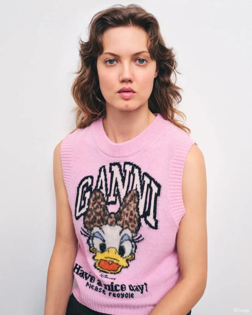 “This collaboration with Disney celebrates a shared commitment to creativity and self-expression,” said Laura du Rusquec, Ganni’s CEO. “Daisy Duck’s confidence and spirit perfectly align with Ganni’s distinctive attitude — it’s a true meeting of cultures. Our goal is to build meaningful partnerships that bring both joy and purpose, while reinforcing Ganni’s global presence and long-term commitment to responsible growth.”