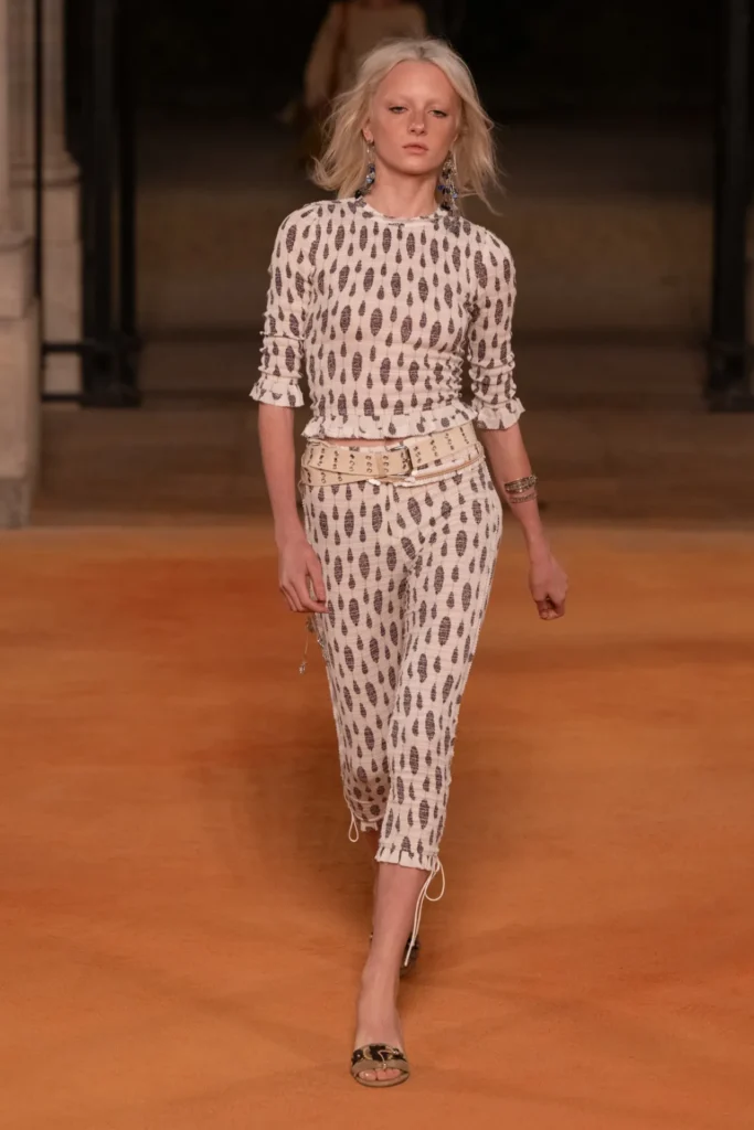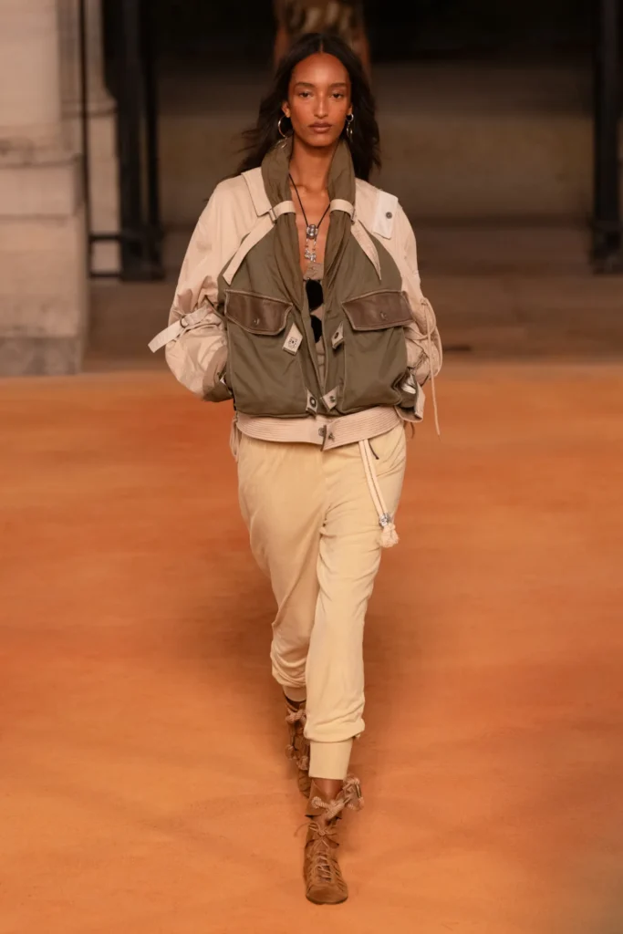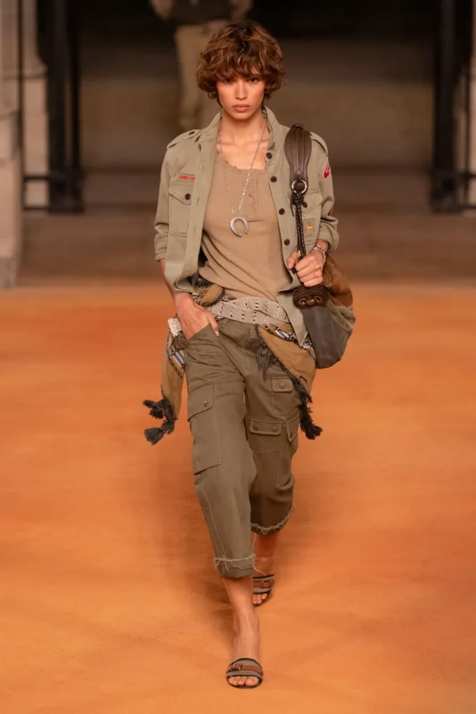 Bekker reinterpreted military jackets with patches, cropped suede vests, and low-slung cargo pants rolled to the ankle, while accessories leaned into nomadic ease: banana-shaped suede shoulder bags, lace-up moccasin boots, gladiator-style sandals in suede with silk ties, and flat espadrille boots printed with wildflowers. These suede boots, younger sisters to Marant’s cult Bobby wedge sneakers, tapped into the season’s shift toward all-day, comfortable flat shoes with a chic twist.