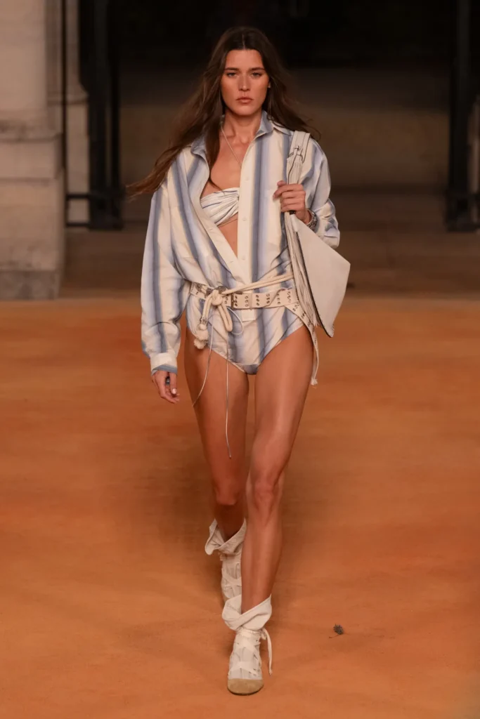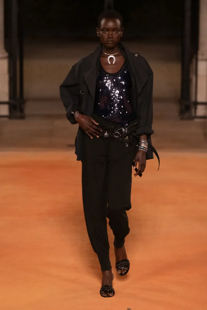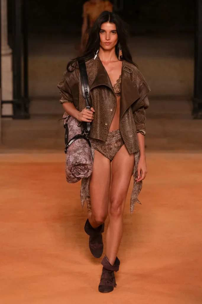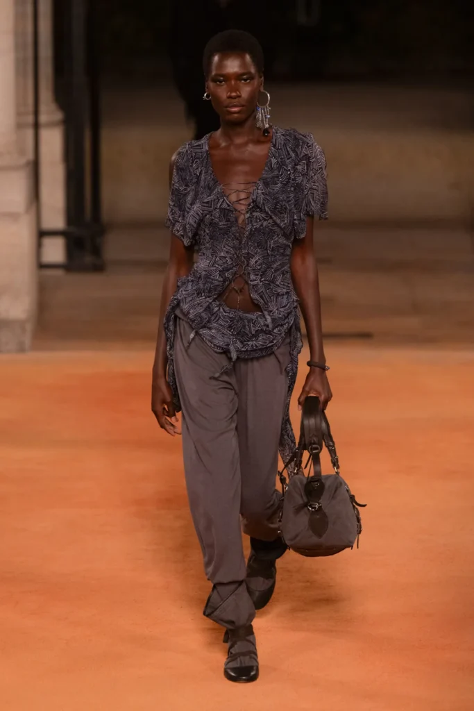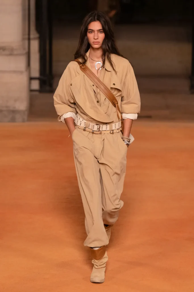 “I was thinking about my own journey, traveling alone, carrying a backpack and a blanket to sleep under the stars,” she explained backstage. That idea materialized literally on the runway, which was blanketed in red earth, and figuratively in details like leather crossbody straps designed to hold rolled-up blankets.
