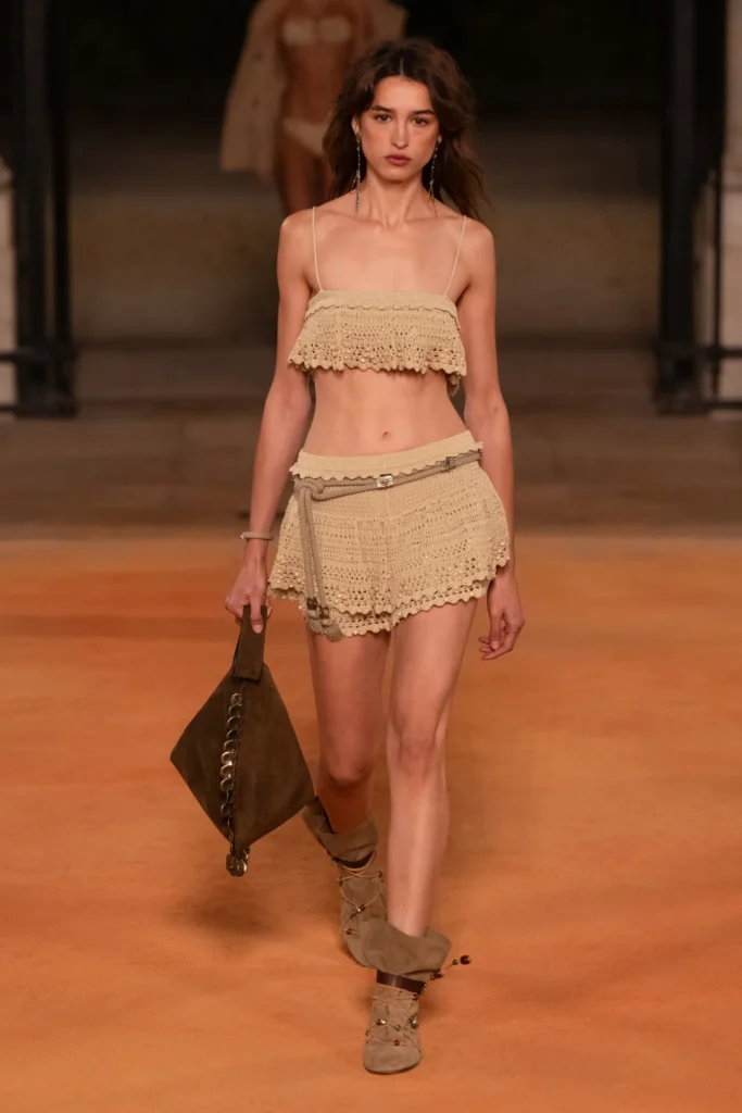 Her daywear captured the same relaxed charm: short silky tees in desert shades, long sheer dresses with off-the-shoulder cuts and ruffled cuffs, and romantic shirtdresses or halter tops in broderie anglaise and eyelets, as if sourced from a tiny village vintage shop.