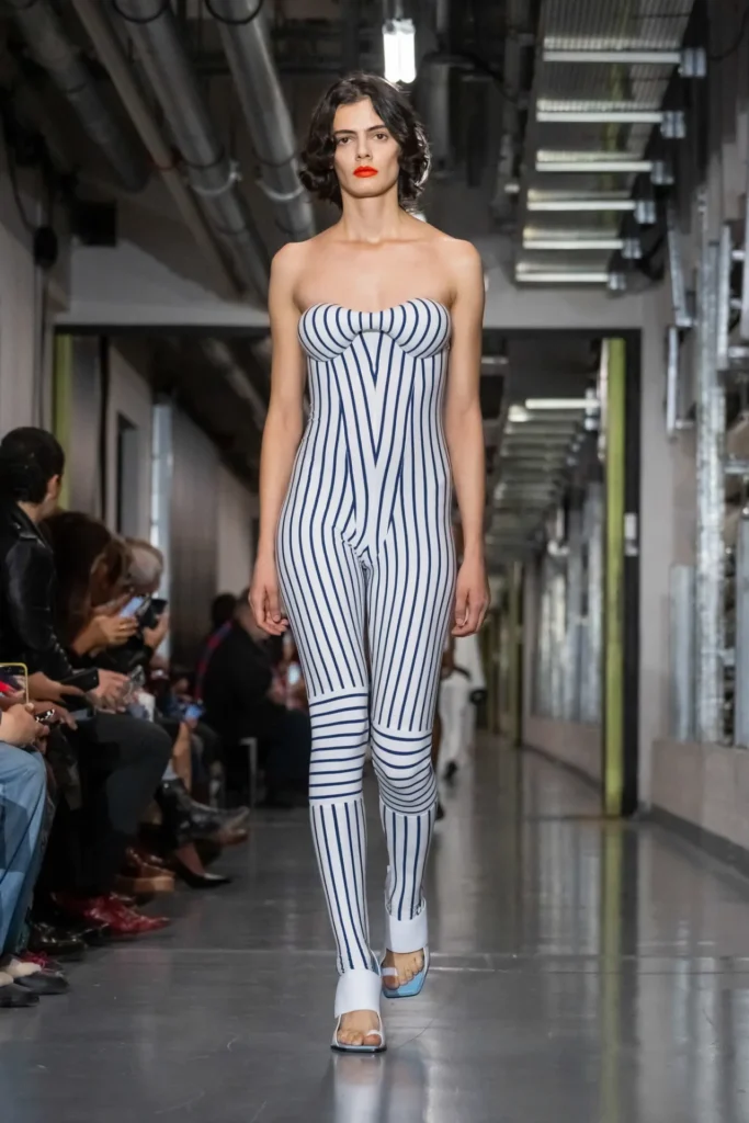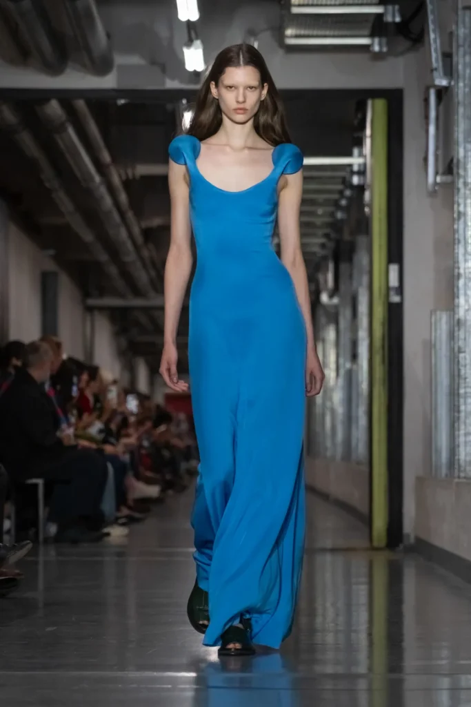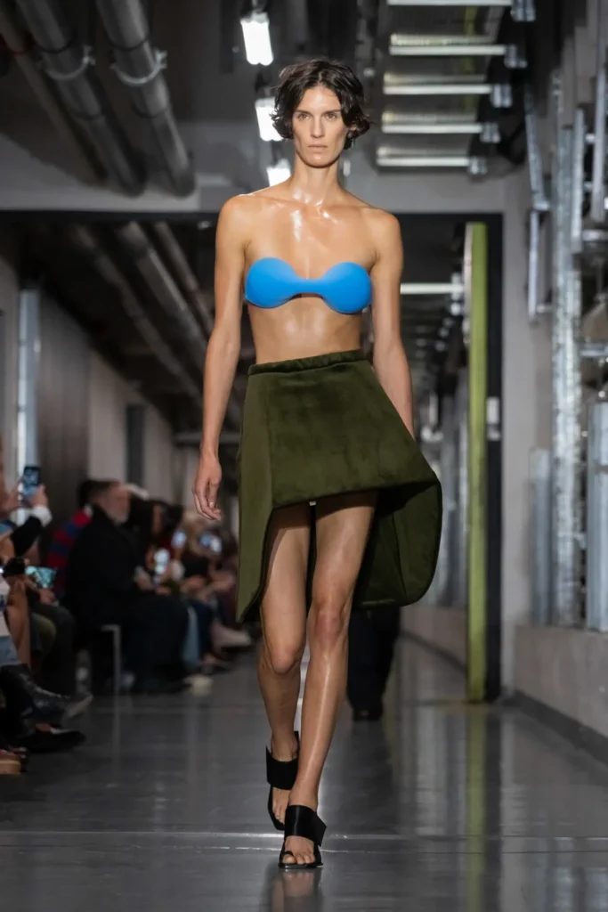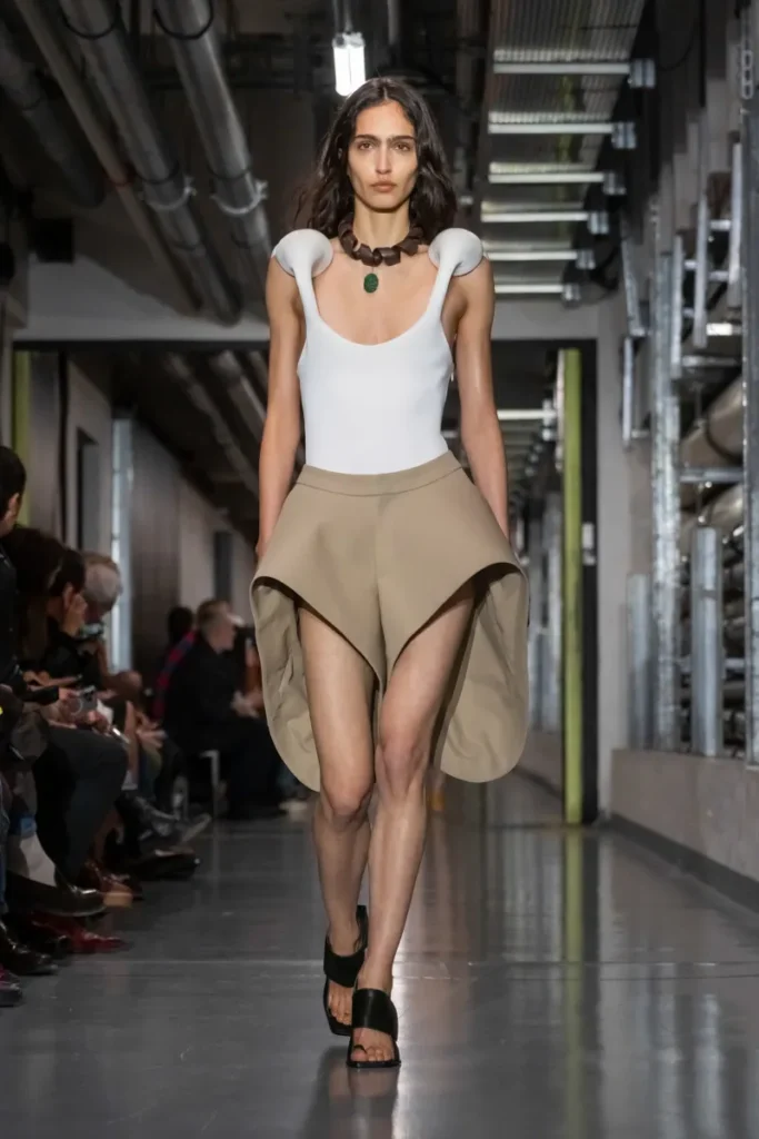 The first look fused the house’s iconic cone bra with Lantink’s own pneumatic, bumper-like silhouettes — a witty collision of eras and egos. What followed was a cascade of gravity-defying constructions: high-cut bodysuits, trench coats sliced clean across the torso, and sculptural dresses that seemed to hover around the body like magnetic fields.