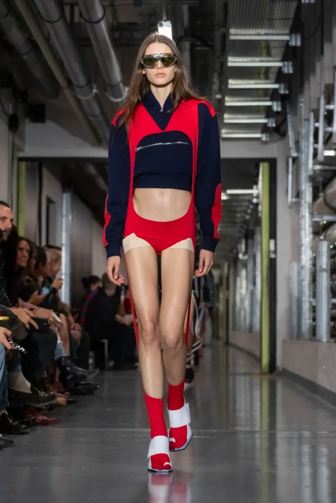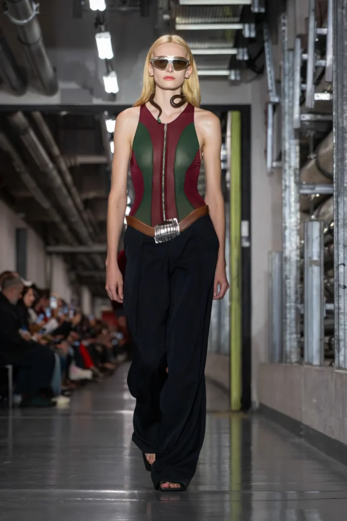 Not every look was meant for real life, but the collection was packed with potential. The printed leggings and cropped tops, sailor-hat-curved jackets, long dresses, and trousers with sculpted waistbands all hinted at what could become wearable desire. Accessories — especially the sunglasses that seemed to float away from the face — added an uncanny, almost surreal dimension.