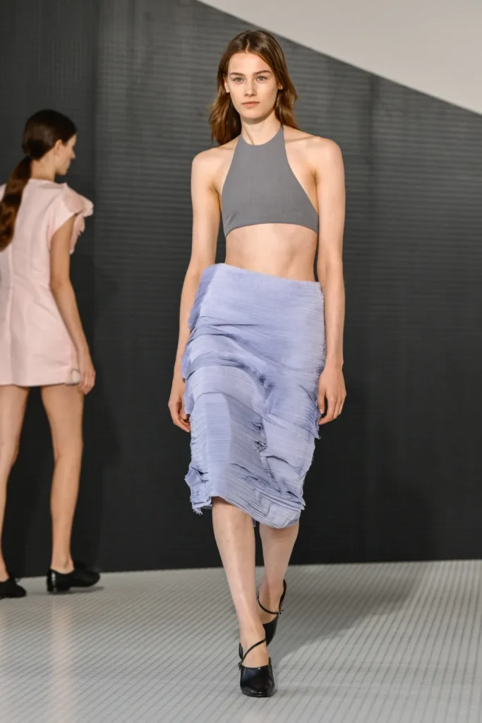 Texture and volume added further dimension. Crisp white shirts were softened with delicate ruffles, while mille-feuille–style layered embroidery enriched sleeveless dresses. Perhaps the most intriguing touches were the geometric protrusions applied to skirts, blouses, and even shoes, directly inspired by Wolfgang Tillmans’ folded paper studies pinned to Bellotti’s mood board.