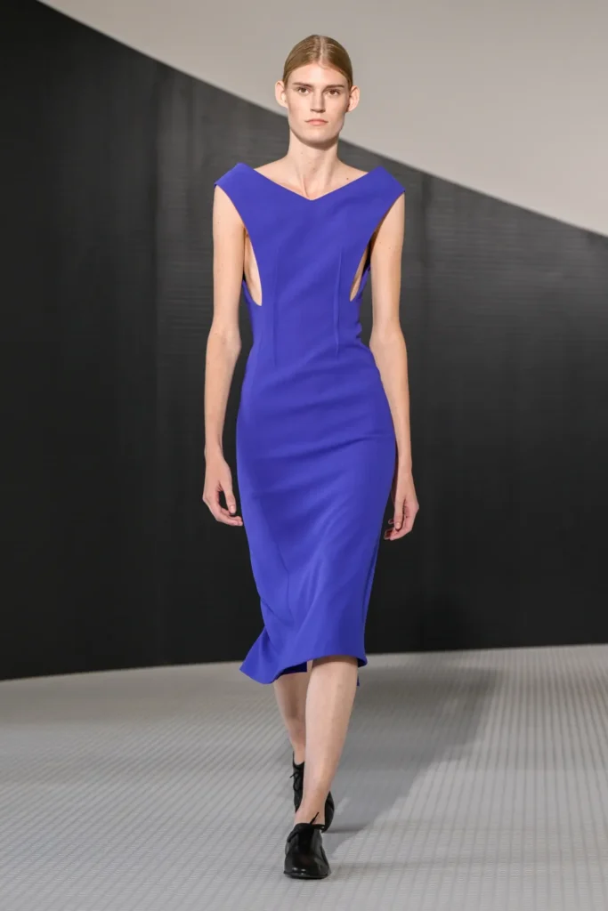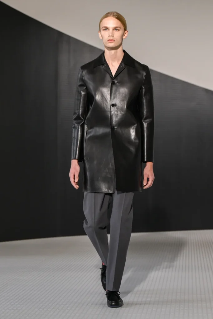 Tailoring anchored the collection with structured blazers, high-buttoned suits in narrow—and occasionally boxy—cuts, and exquisitely crafted leather coats designed for both men and women. Innovation came through in subtle yet striking details: diagonal slashes reminiscent of Lucio Fontana carved across shirts and pencil skirts, cutout waistbands on trousers, and circular eyelets on sleek dresses that exposed coordinated lingerie.