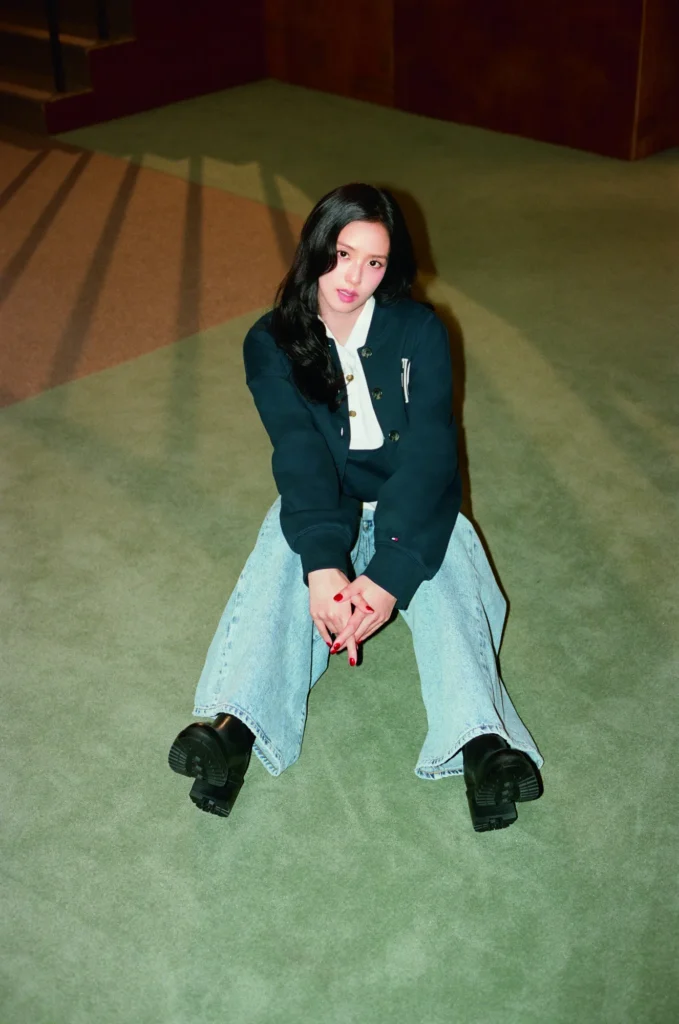Photographed by Yoon Ji Yong and styled by Choi Ja Young, the campaign celebrates Jisoo’s timeless yet youthful approach to fashion. In one look, she wears a tailored bomber layered over a crisp Oxford shirt, paired with a pleated wool-blend mini skirt and classic loafers. Another ensemble features a varsity jacket over a plush rugby sweatshirt, matched with high-rise, wide-leg ’70s jeans — a nod to Hilfiger’s signature Americana. A “Lady Jacket” with a textured preppy finish completes her standout looks.