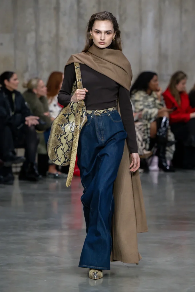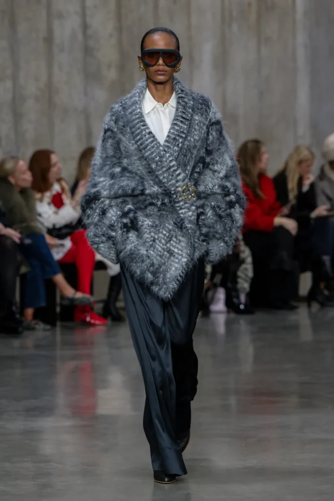 Knitwear stood out. An oversized white double–turtleneck sweater, styled with aviators and a gold shoulder bag, distilled the brand’s appeal into a single look: elevated, unfussy, camera-ready. Chunky cardigans, some draped off the shoulder or wrapped across the torso, reinforced the tactile dimension Arena sought—depth created through yarn rather than ornament.