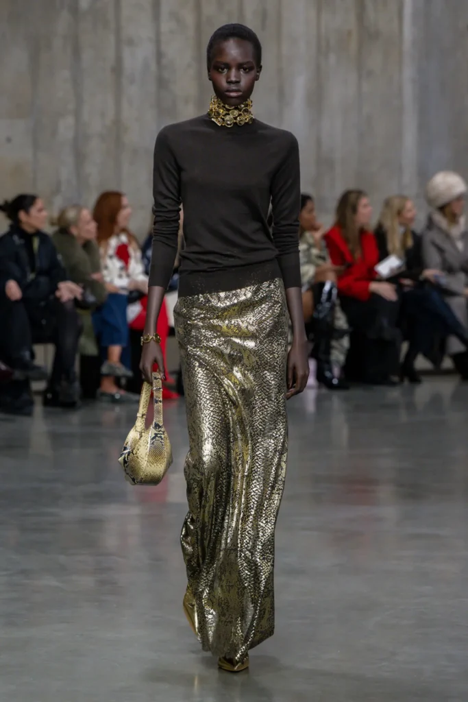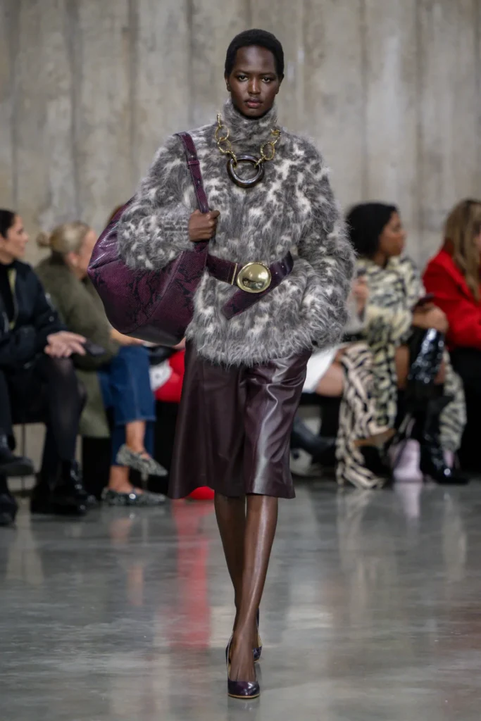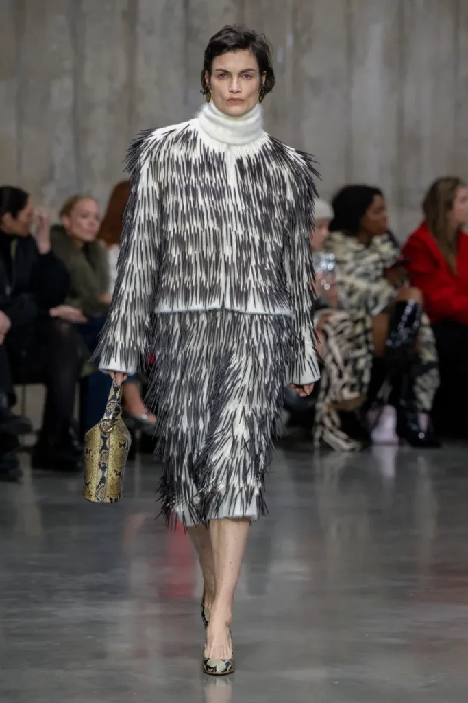 Arena emphasized craftsmanship as part of a broader repositioning of the house. Feather fringe traced the front of knit dresses and skirt suits; cast-gold belt buckles and substantial cuffs marked the debut of expanded jewelry and accessories. Yet the collection’s strength lay in its restraint.