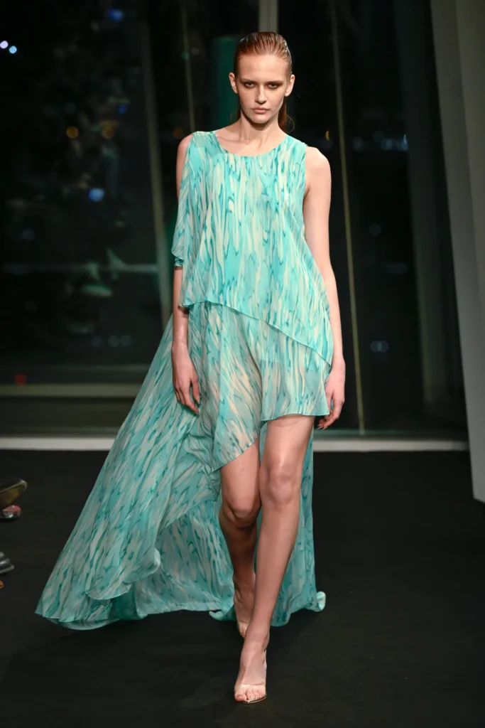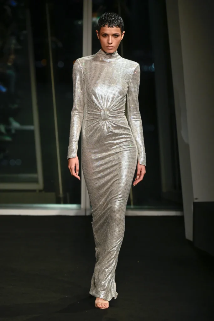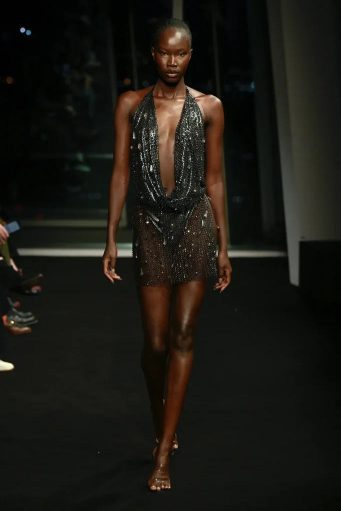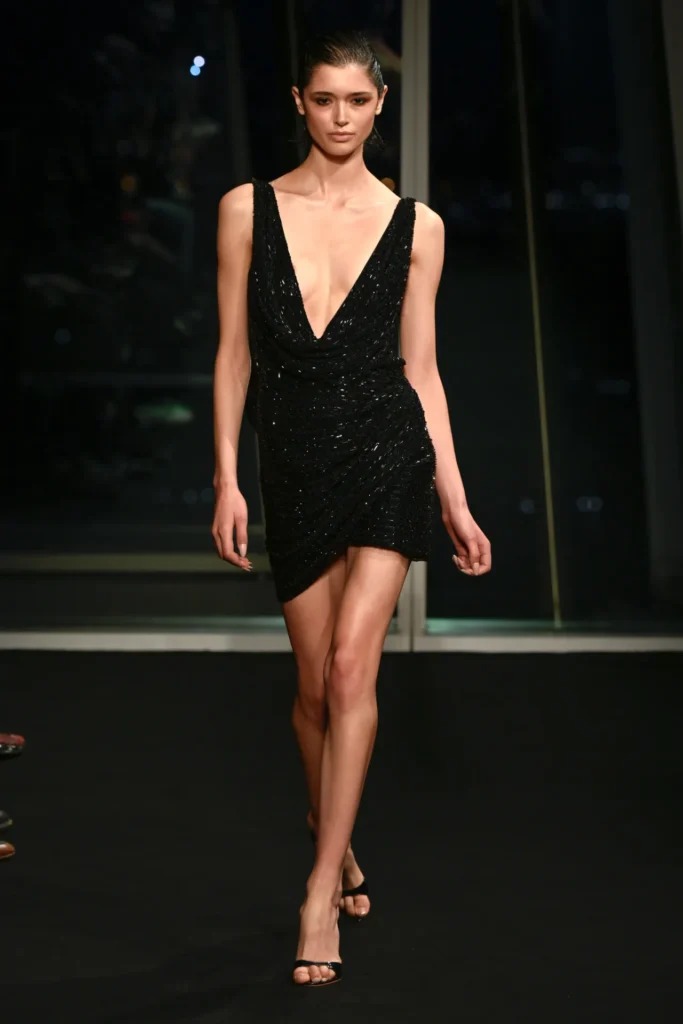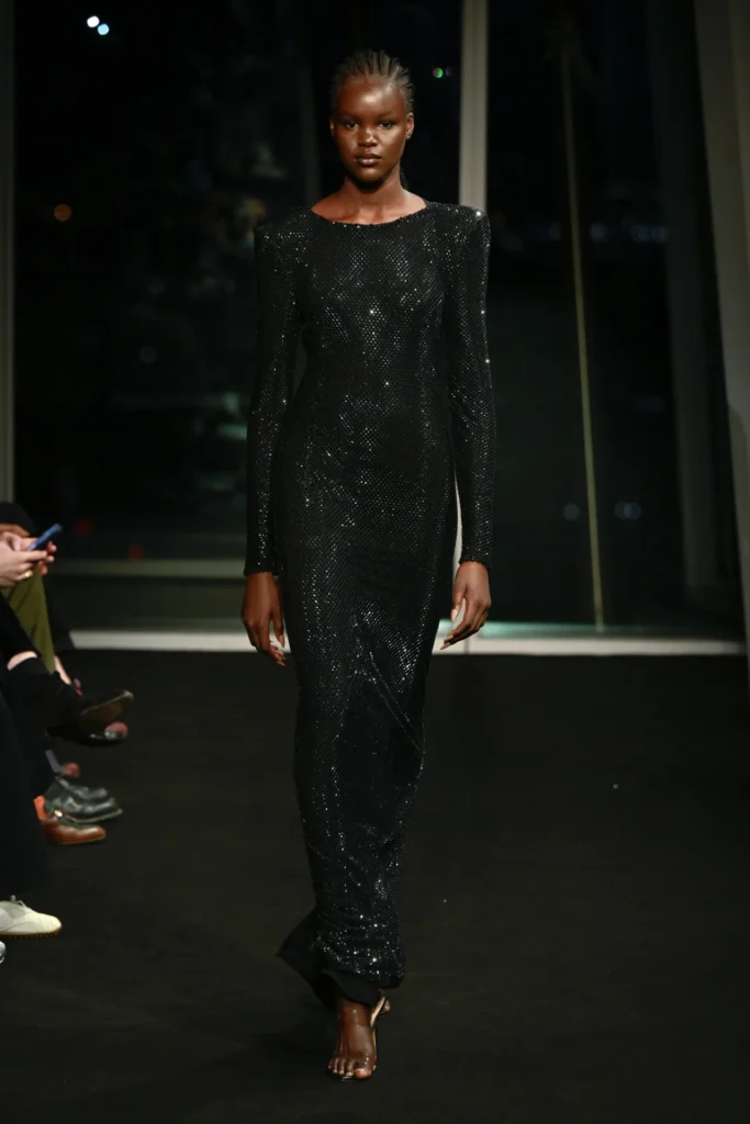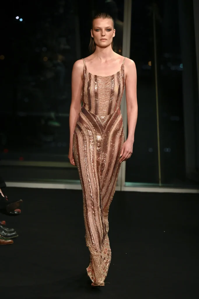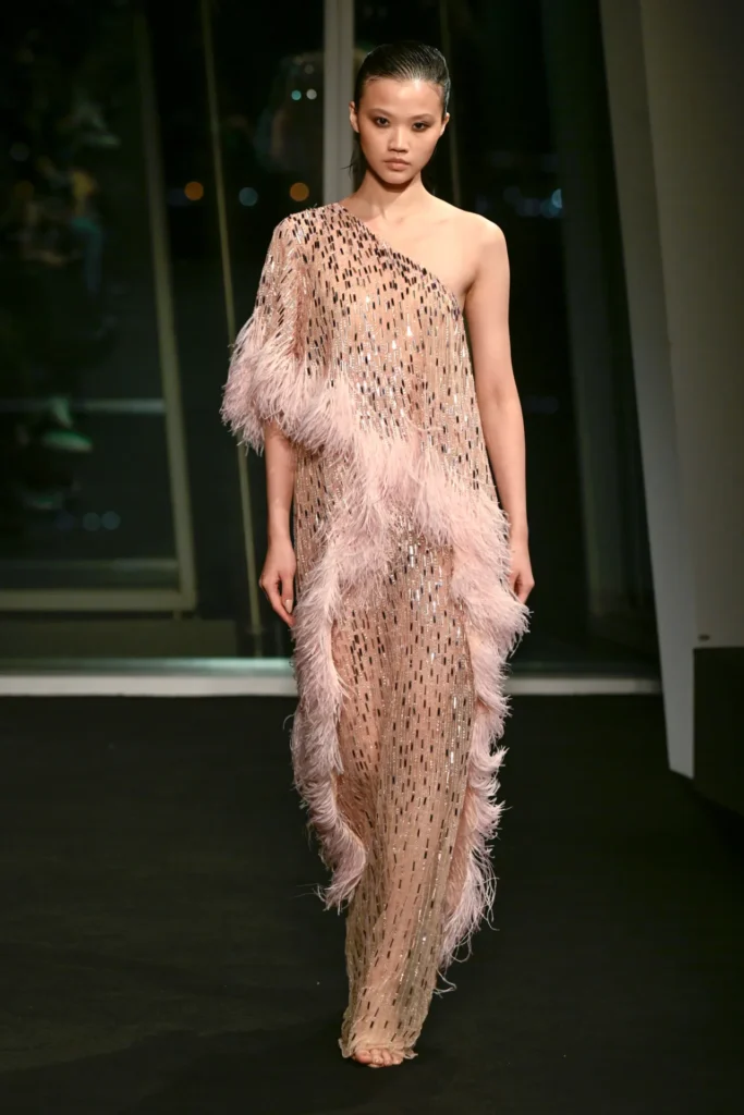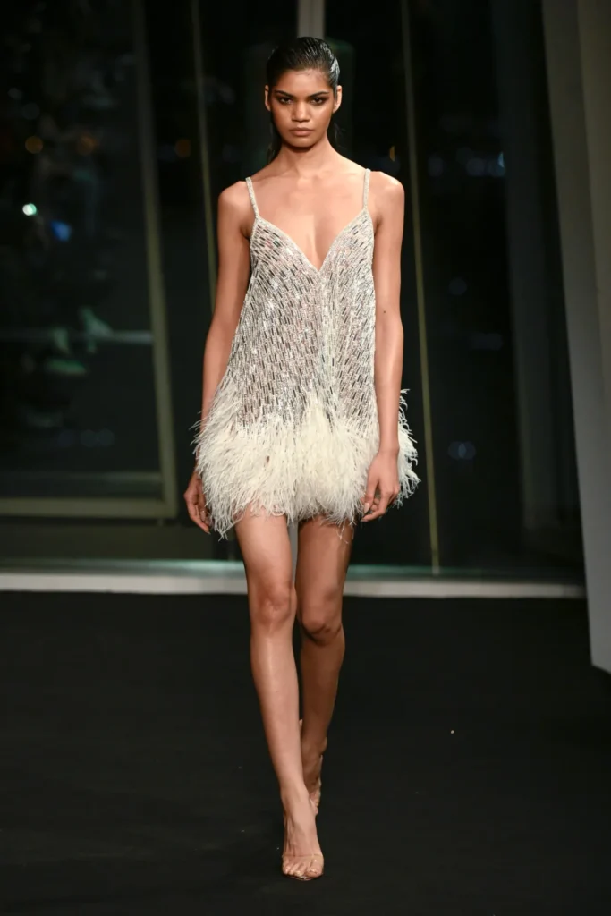 The collection drew directly from the iridescent hues he once watched reflect across the building at dusk—rose gold, burnished amber, electric turquoise. Body-skimming gowns in molten metallics featured strong shoulders and plunging slits. Flapper-inspired dresses shimmered in highlighter yellow fringe. Diaphanous capes trimmed in teal feathers floated like sea spray, conjuring a Tahitian horizon rather than a London winter.