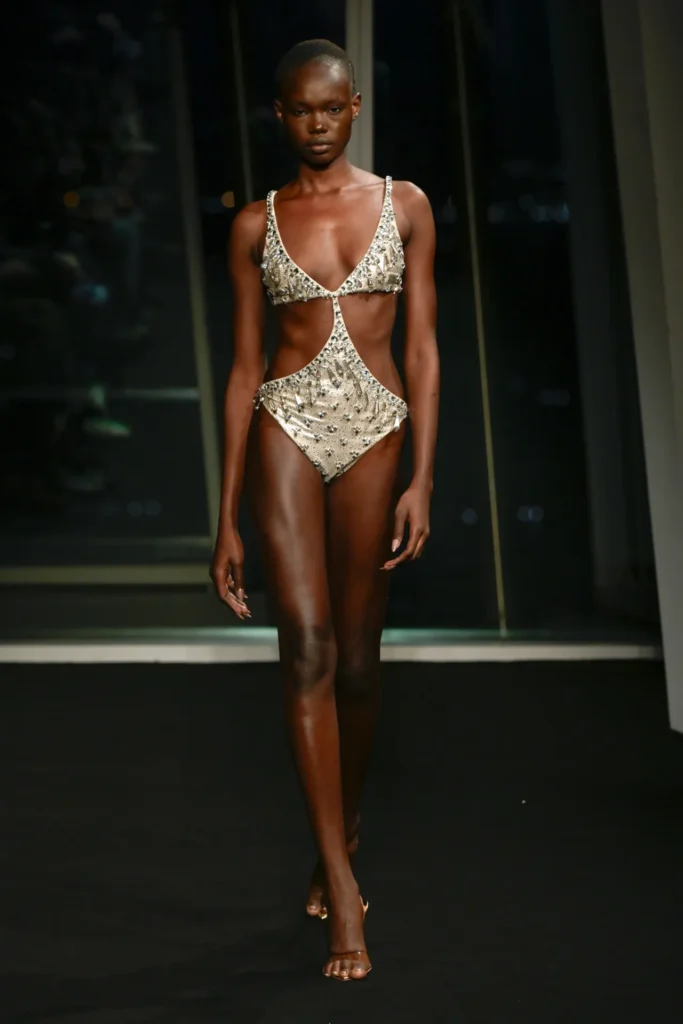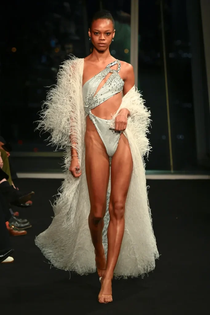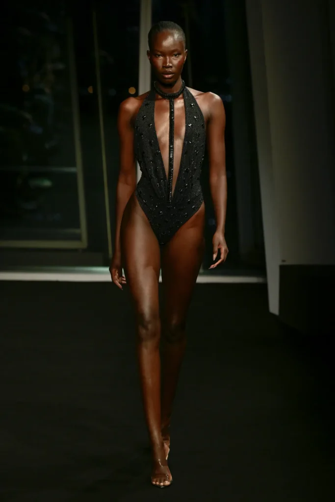 But beyond the theatrics, there was strategy. Macdonald is pivoting toward warm-weather dressing, with a sharper focus on resort and elevated ready-to-wear. Swimwear—cut with his signature sensuality—signaled the shift. Prices are being recalibrated, and distribution streamlined: direct-to-consumer via his website, salon presentations in luxury resorts, and exclusive pieces for retail partners including Harrods and Selfridges.
