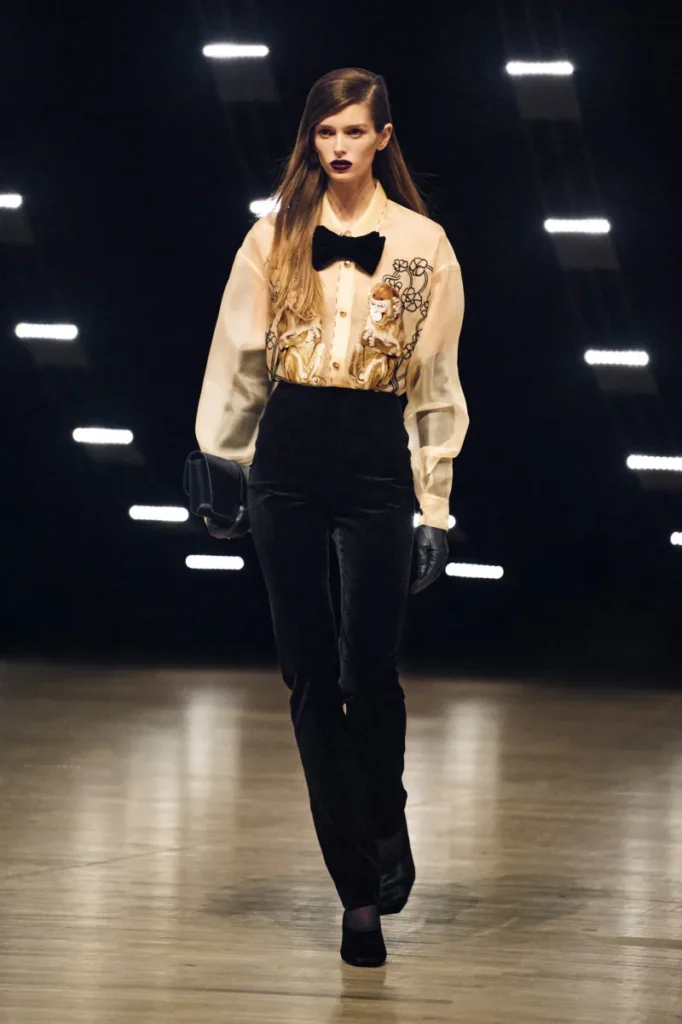 Elsewhere, exaggeration ruled: military-trimmed jackets with ornate buttons, velvet floral suits, oversized bow ties, and cross-body chains evoked a theatrical masculinity reminiscent of Hitchcock-era intrigue. Even evening skirts bore painterly motifs recalling Milton Avery, grounding the collection in an art-world lineage while questioning its authority.
