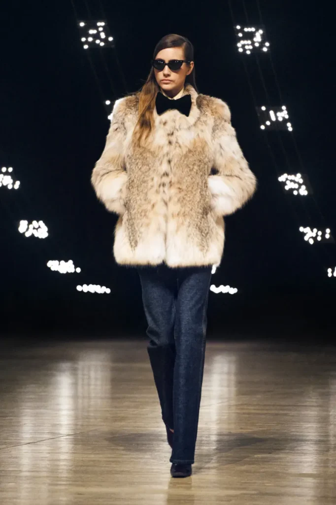 Yet Holstein disrupted the polish with subversive contrasts. White lace slip dresses—delicate, almost bridal—revealed sheer panels and bustle backs, styled with inky, elongated nails and glossy leather opera gloves. Hyper-femininity met menace. Embroidered monkeys appeared on diaphanous blouses, a wink to the flamboyant male impostors in Welles’ film and a subtle nod to ’70s dandyism.