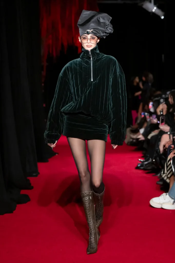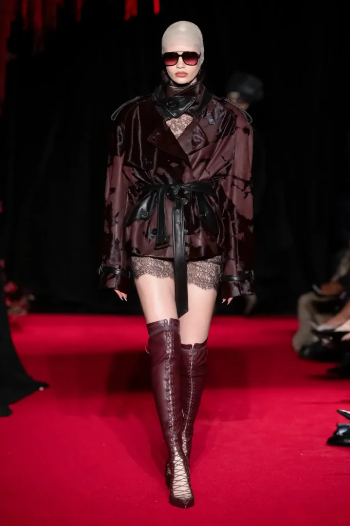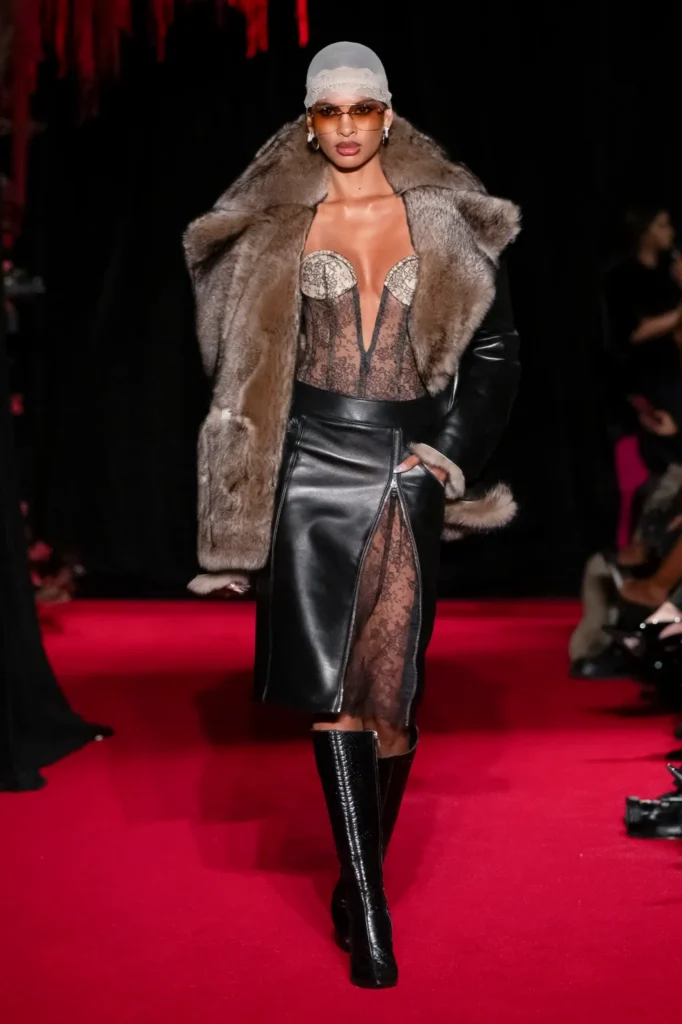 Tailoring led the charge. Velvet tuxedo jackets were cut razor-sharp; a bow tie reimagined as a bikini top turned black-tie tradition into provocation. A crimson velvet pantsuit skimmed the body with predatory precision, while leather miniskirts zipped in zigzag lines suggested motion—fast, dangerous, unapologetic. These were clothes engineered for impact, whether in a boardroom or beneath nightclub strobes.