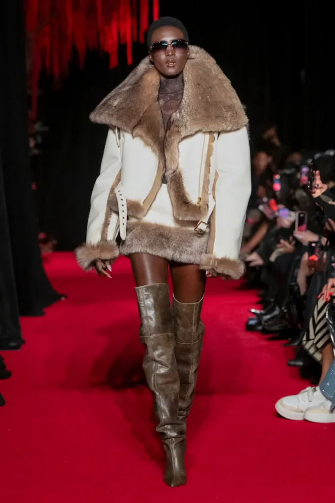 Backstage at his Long Island City headquarters, Smith made his position clear. Though industry fur bans have shifted the landscape, he sidestepped faux alternatives in favor of shearling, sculpted and fluffed to mimic Arctic fox. It trimmed oversized jackets and edged the hem of an ivory dress—demure by his standards, but styled with the hauteur of a ’60s screen siren.