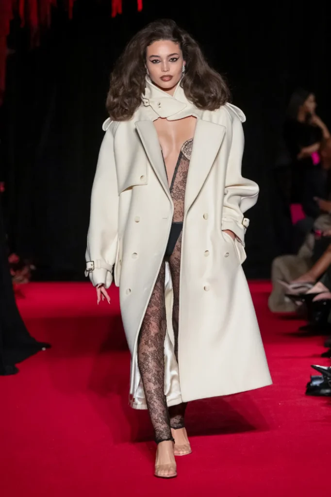 Smith signaled a shift away from the overt catsuit formulas that built his name, leaning instead into pieces with broader commercial pull. Lingerie details—lace insets, strategic embellishment—threaded through the lineup, offering intimacy without sacrificing polish. Accessories, including sunglasses created with Barton Perreira, expanded his diva lexicon into wearable fantasy.