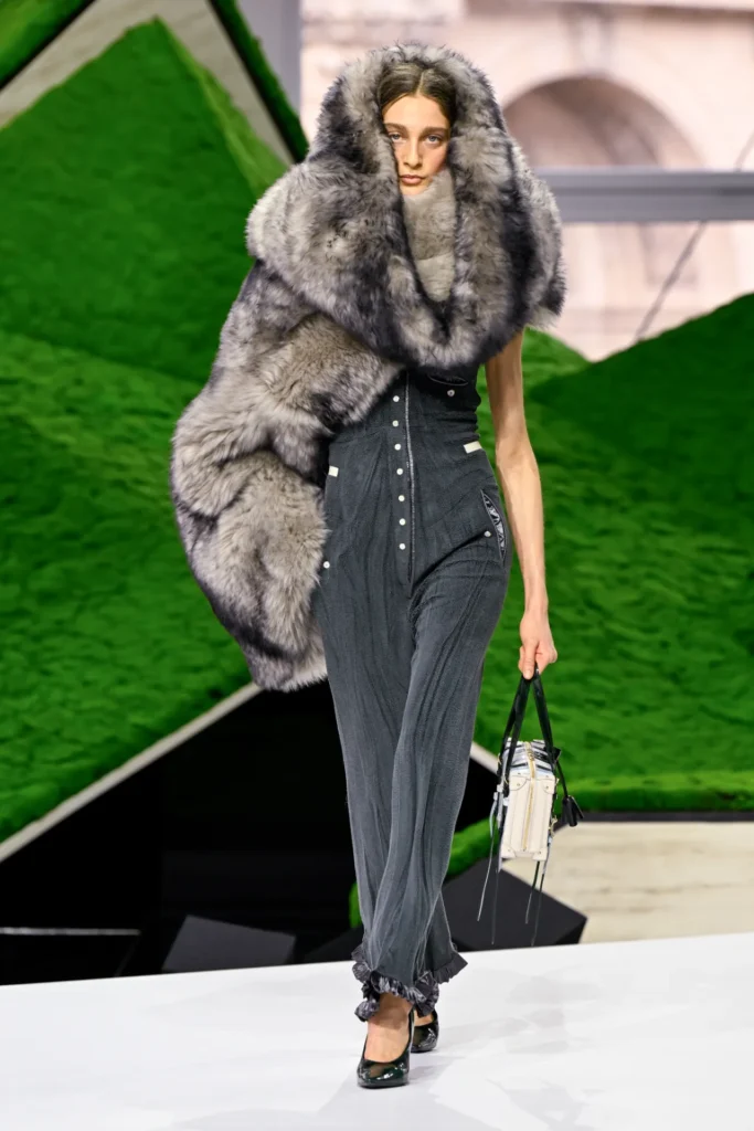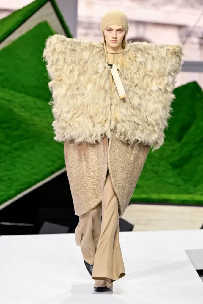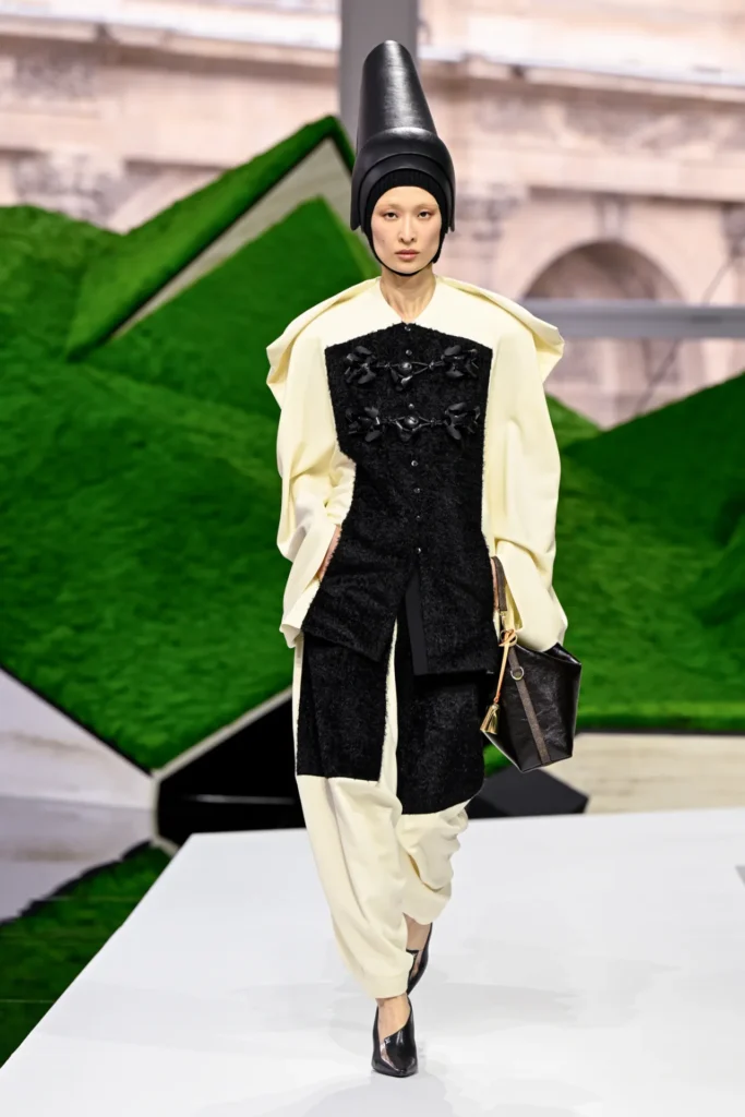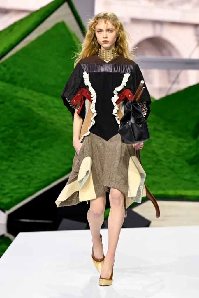 The runway told that story through texture and silhouette. Plush layers, felted hats, shearling pieces, and bell-like accessories evoked the practical wardrobes of high-altitude life. Yet the results were unmistakably Ghesquière: architectural shapes, unexpected proportions, and hybrid garments that blurred past and future.