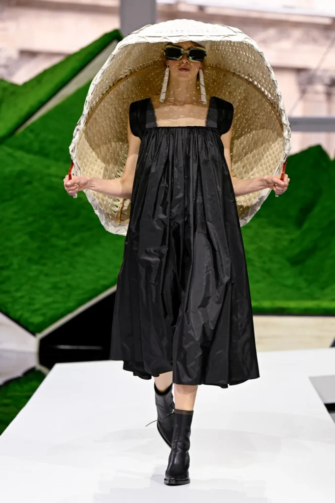 Clothes ranged from patchwork jumpsuits and short leather jackets to sweeping waterproof capes with sculptural volume. Conical hats and rigid capes with open shoulders pushed silhouettes into unfamiliar territory. Texture played a central role throughout the collection: shaggy surfaces, layered fabrics, and experimental tailoring.