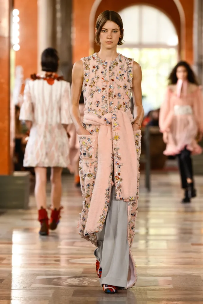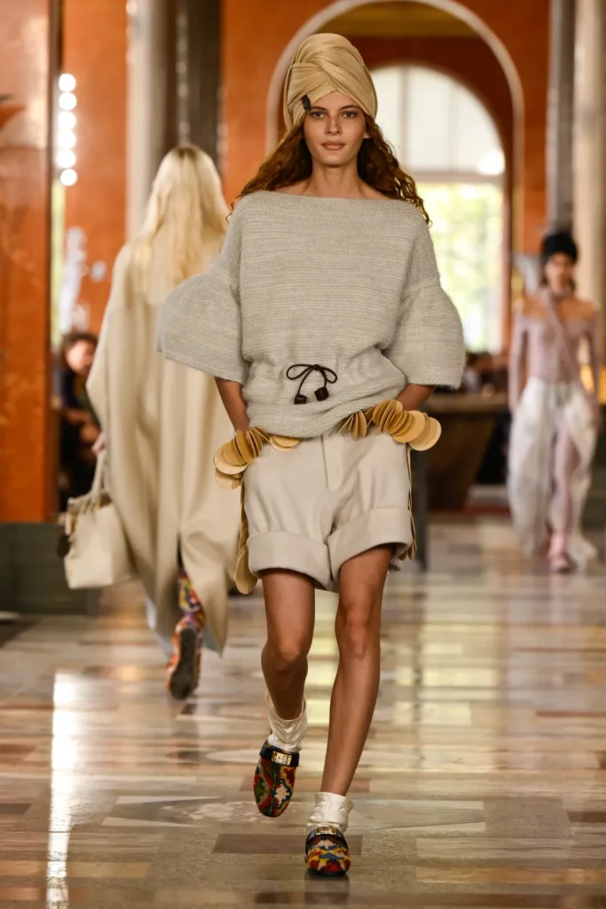 That vision took shape in a collection filled with comfort elevated to luxury: plush teddy-bear coats cut like bathrobes, fuzzy knit sweaters, low-slung shorts, and toga-like dresses. Yet Ghesquière’s experimental streak remained intact: a camel coat cleverly disguised as a jumpsuit appeared throughout, while a sleeveless robe dusted with gemstones —crafted in brushed silk to mimic mink— reintroduced an ancient artisanal technique.
