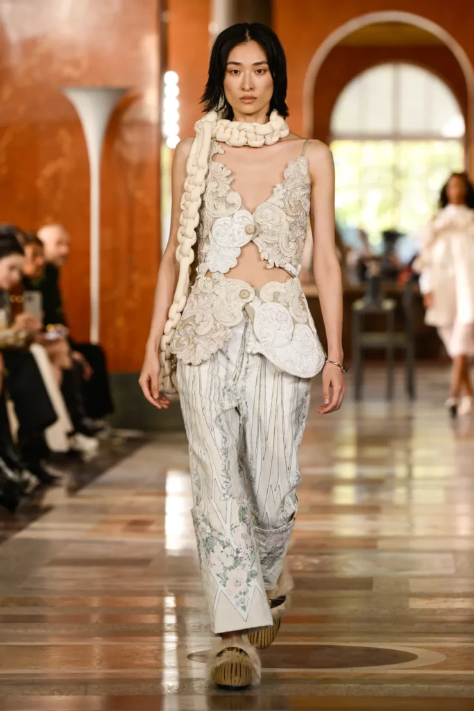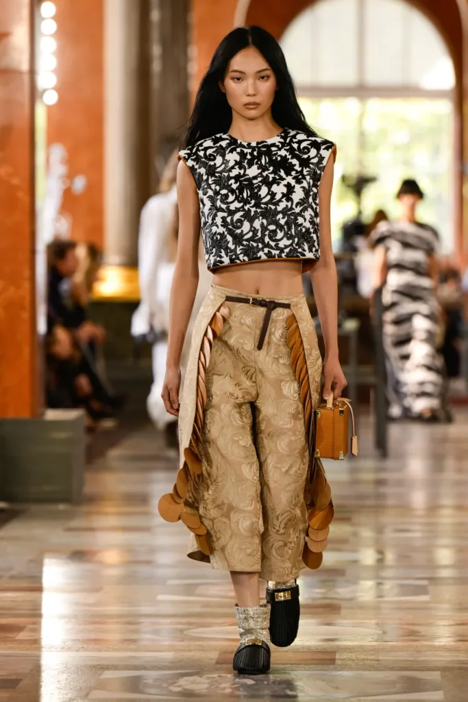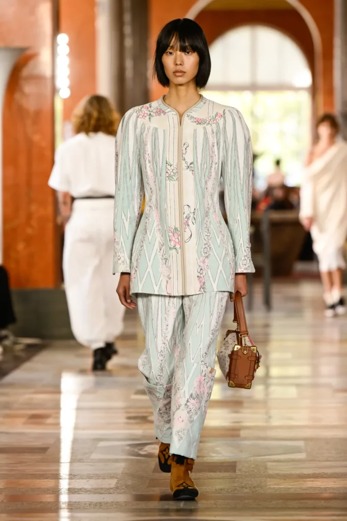 The lineup balanced ornament and simplicity. On one side, a triangular tabard richly embroidered with floral motifs and fringe ensembles where each strand was beaded in gradient colors, blurring into the vision of a hazy garden. On the other, pared-down cotton tops, wide-legged silk pants, and even socks with sandals —though rendered in shimmering brocades, unmistakably Vuitton.
