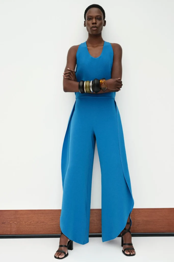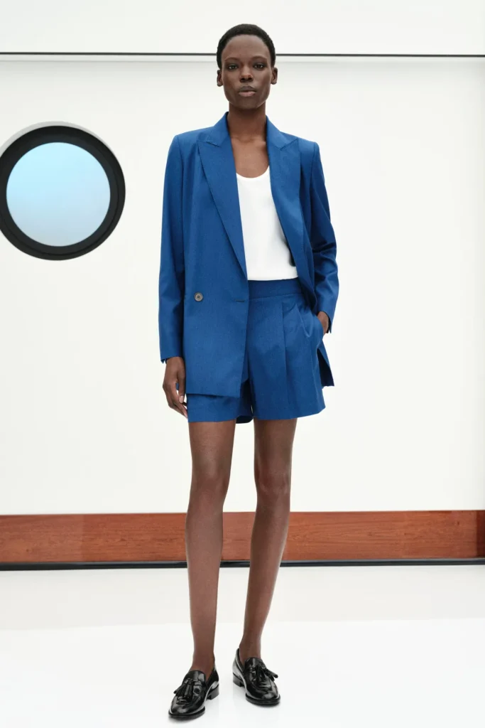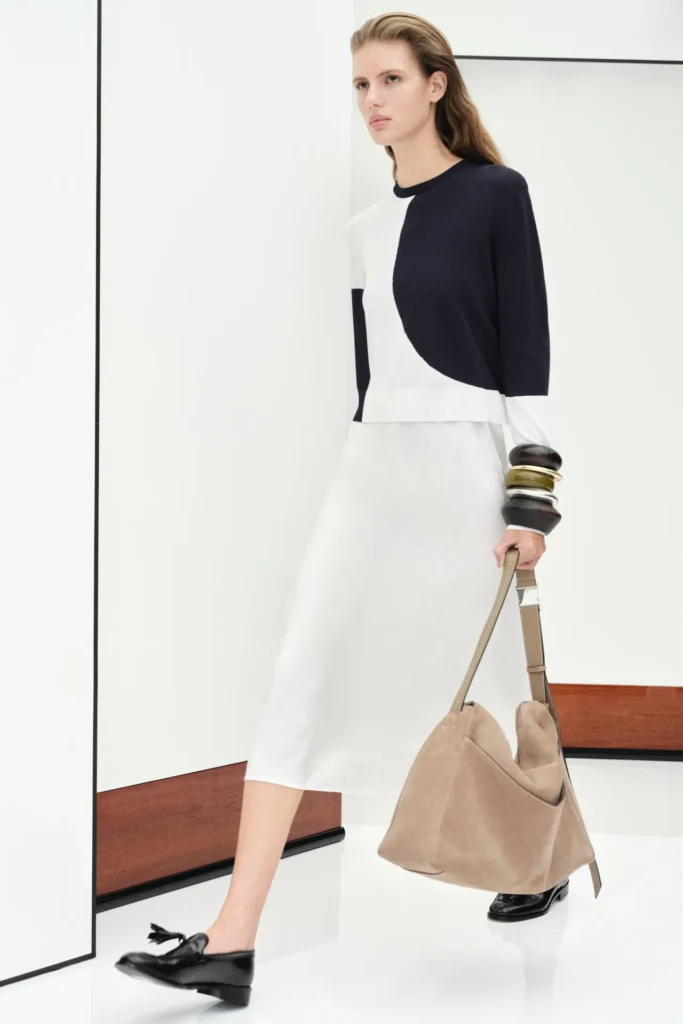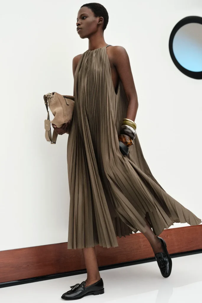 He leaned on the pleating technique also for the new designs, encompassing a breezy duster coat, fluid pants, pristine sleeveless blouses to wear with matching bias-cut skirts, and taffeta maxi frocks to style with chunky-heeled sandals or sleek loafers for daytime occasions. While an archival floral pattern and spots evoking portholes appeared on dresses or a whisper-thin knit, the collection was mainly made up of color-blocked pieces, the best of which were, as expected, the tailored options, such as the Olimpia blazer in a new white version, a pinstripe jersey suit and a light ecru belted coat — highly impactful even with its sparse lines and stripped-down appeal.