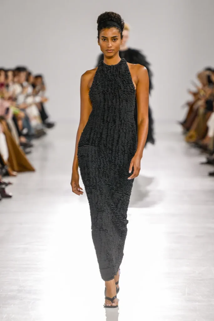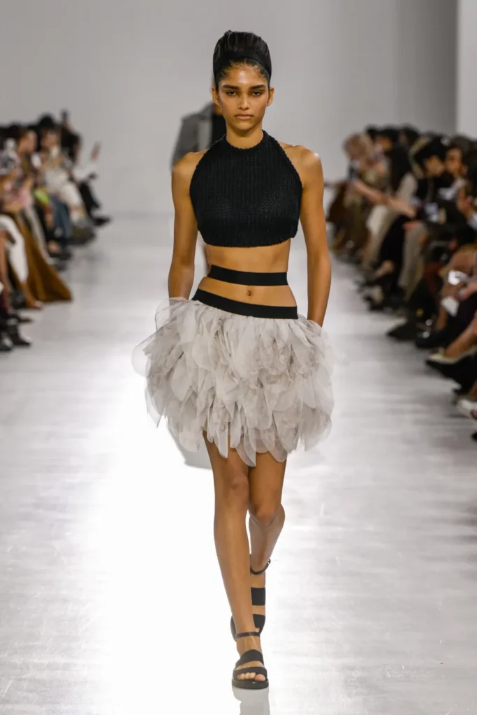 Though heavy with historical allusions, Griffiths made his intent clear: “We’re not making a BBC period drama; we’re creating modern fashion for modern women.” That philosophy translated into body-conscious knitwear, cropped jackets, halter necklines exposing shoulders and backs, and harness-style elastic details defining the waist.