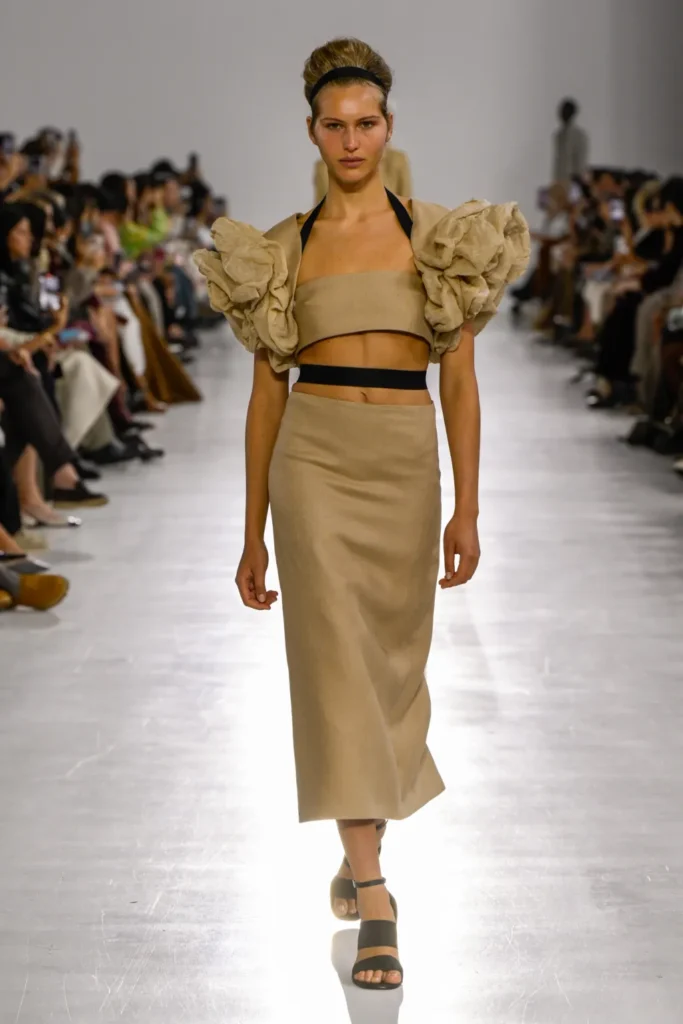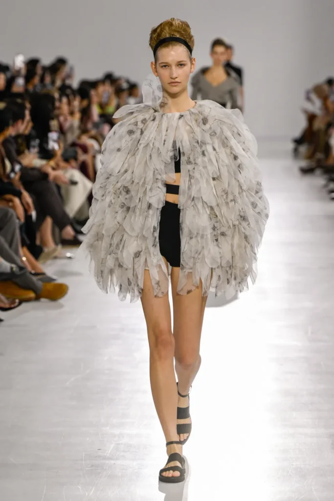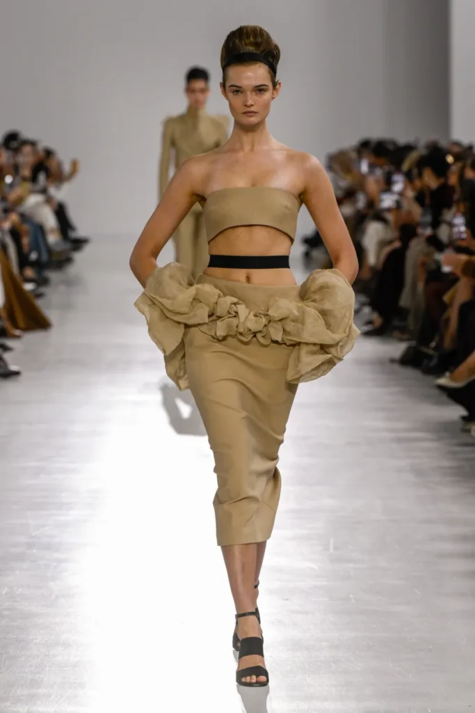 The palette leaned heavily into camel and beige, only occasionally interrupted by delicate florals or ghostly marine motifs, underscoring the house’s commitment to a more minimalist aesthetic amid Milan’s current maximalist wave. Yet, Griffiths injected organza garlands, fabric petals, and layered ruffles at shoulders and hips, infusing the collection with a fresh Rococo edge.