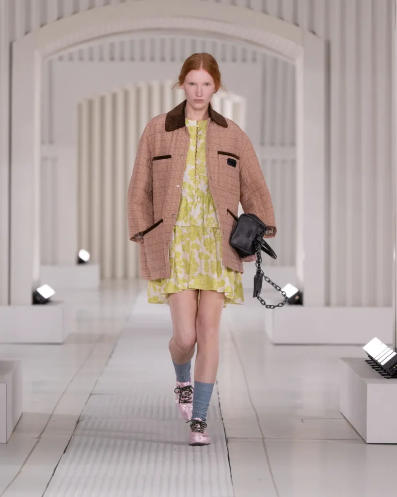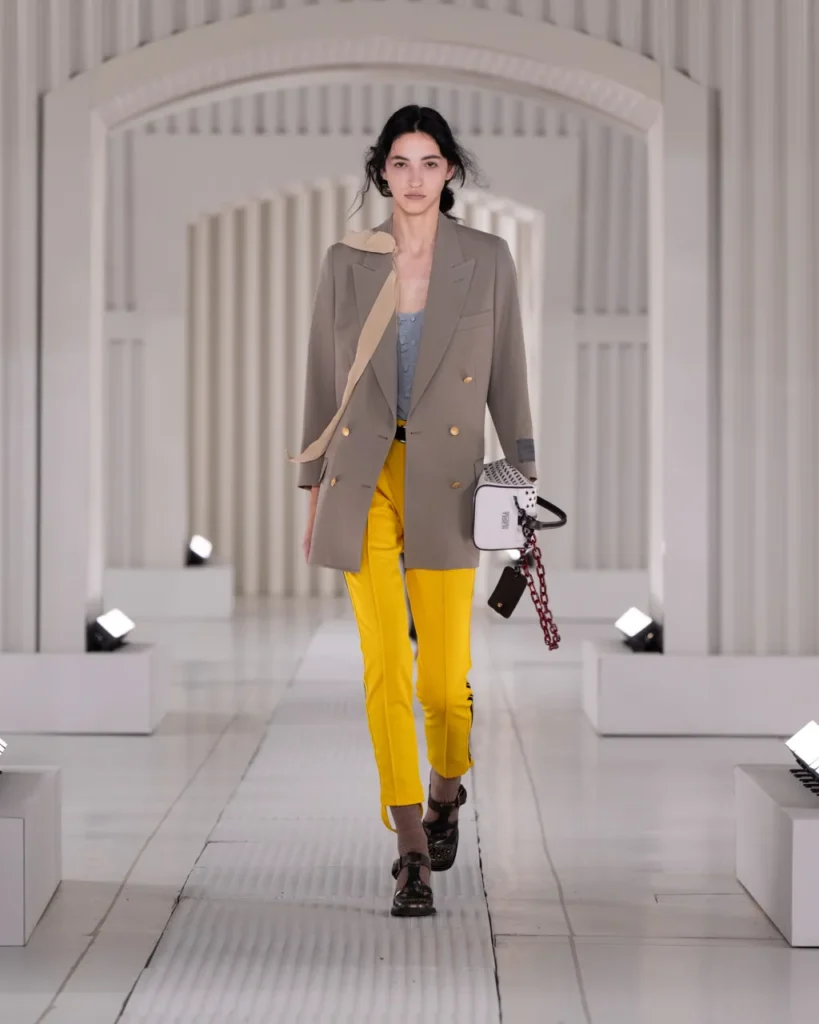 For Spring 2026, Andrea Pompilio elevated Onitsuka Tiger’s sporty DNA into a sleeker, more polished wardrobe. The show opened with structured jackets styled over vintage running shorts and slim joggers, setting the tone for a collection where tailoring met athletic ease. Oversized coats followed, along with sharply cut shirts in bright yellow tweed, a nod to Parisian couture houses but filtered through the brand’s street-infused lens.