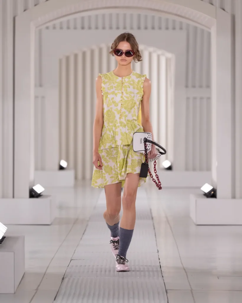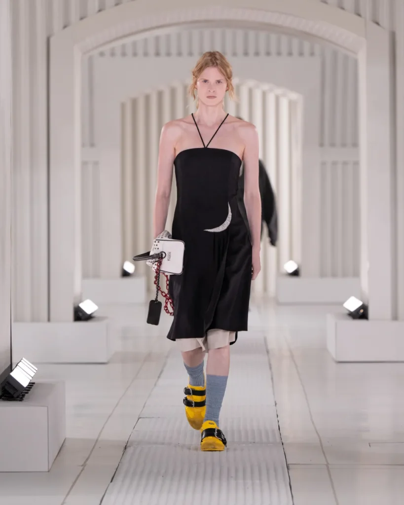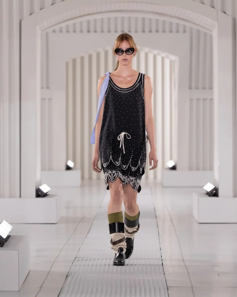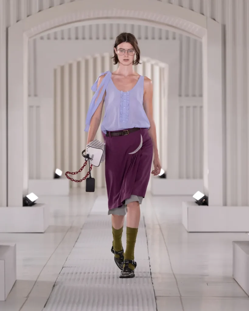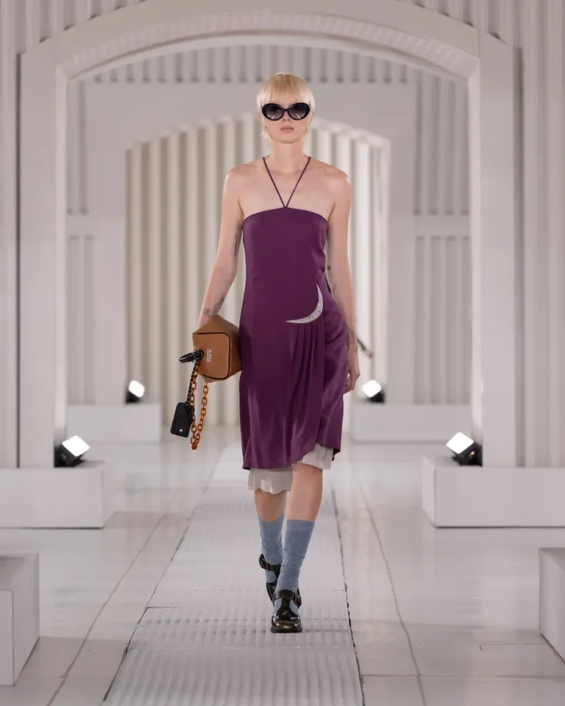 One of the most striking moments came with the paper-effect leather miniskirts worn low on the hips, juxtaposed with a shiny black flapper-style dress finished with a flowing lavender ribbon at the neckline. Other pieces, such as square-cut, button-front dresses, added a playful yet slightly disheveled touch to an otherwise vibrant and busy runway.