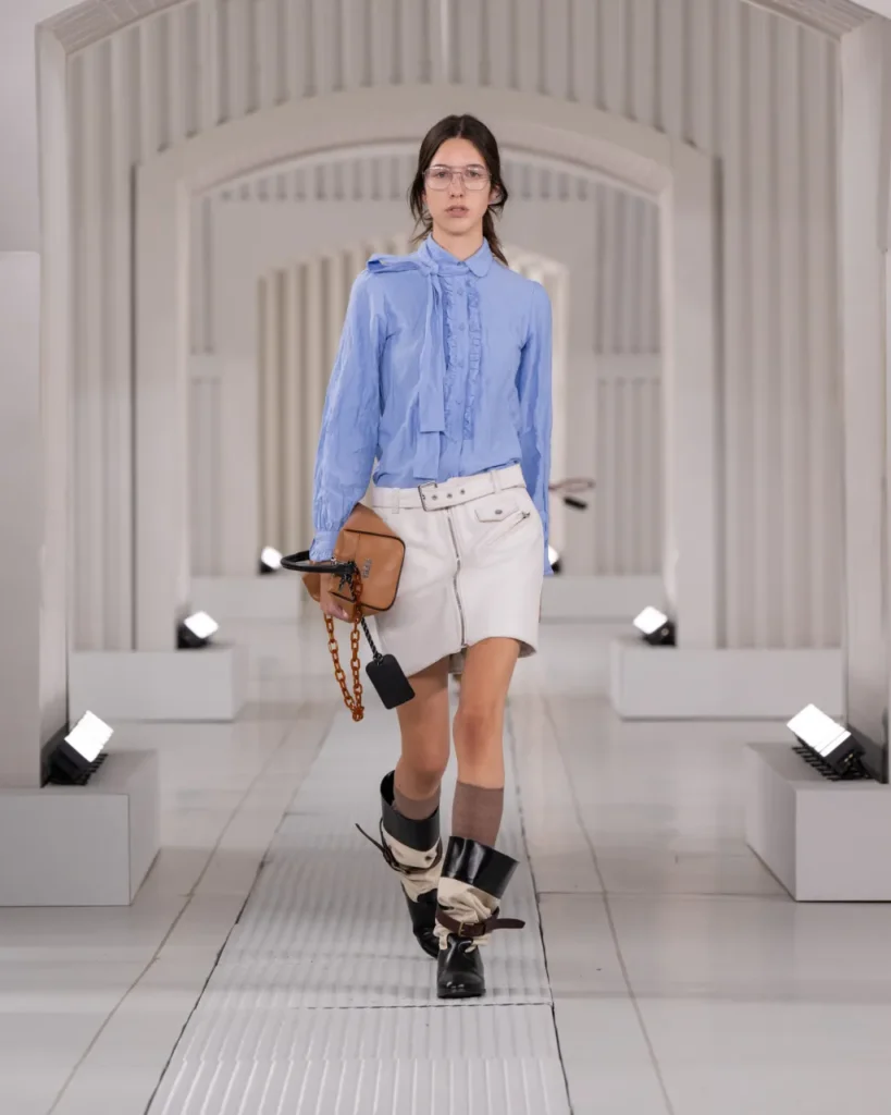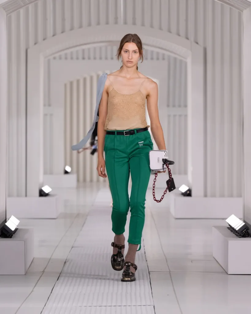 Although loose striped sweatpants, boxy jogging shorts, and oversized hoodies stayed on the runway, Pompilio softened their casual edge with ruffled blouses, wrinkled cotton shirts tied with ribbons, and fluid dresses that looked as if they had just been pulled out of a gym bag—paired, of course, with the label’s iconic Mexico 66 sneakers.