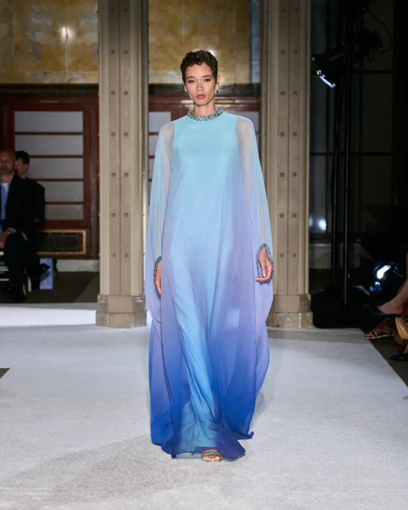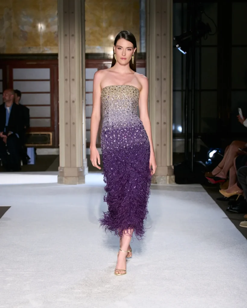 The venue, styled as an intimate library, framed the show as if it were an exhibition. Among the standout pieces was a cocktail dress crafted from laser-cut plexiglass, worn like a sculptural armor. Flowing ombré chiffons and layered organzas added movement and depth, while dense beading, sequins, and metallic appliqués amplified the collection’s theatrical spirit.