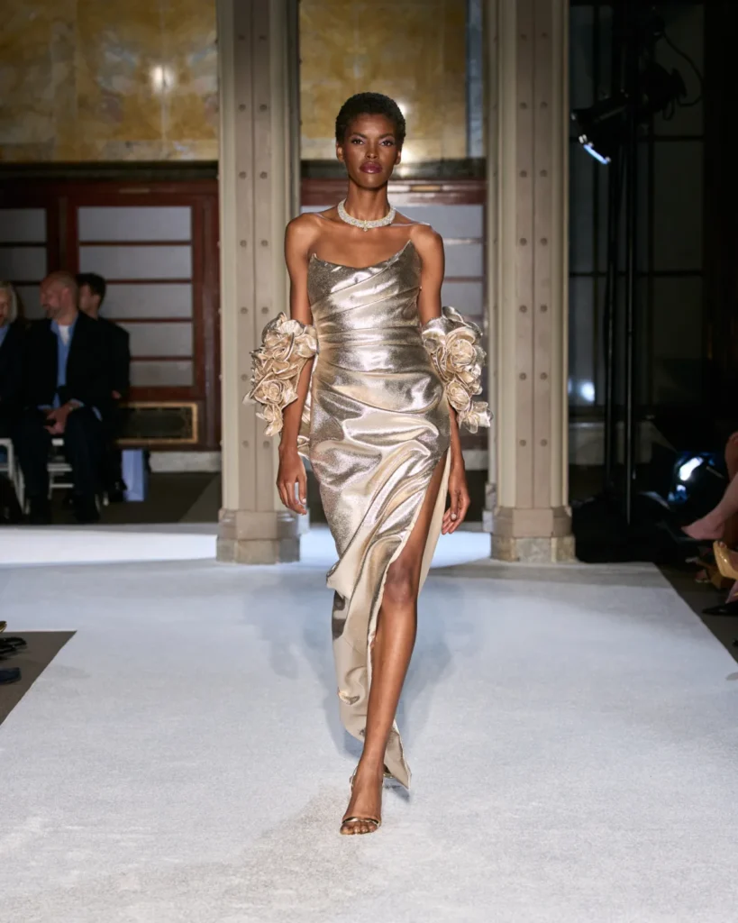 Styling was kept modern yet understated — sleek hair, refined makeup, and minimalist strappy heels — so that textures and structures remained the true focus. Overall, Pamella Roland Spring 2026 delivered a cohesive and cinematic vision, where each piece functioned as both a contemporary evening statement and a wearable interpretation of mid-century artistic sensibilities.