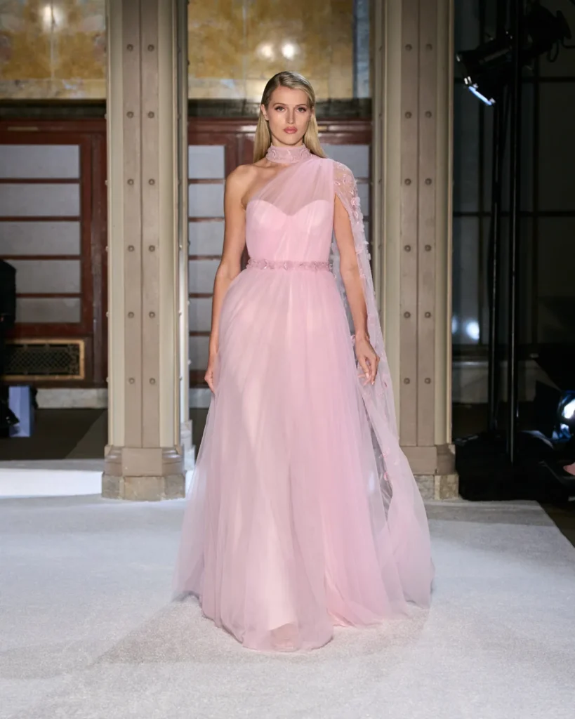 Color was used as a narrative tool, shifting between jewel tones, soft monochromatic pastels, and unexpected pops of brightness. Evening gowns cut on the bias, with dramatic trains and concentrated embellishments, embodied both power and refinement, ensuring their impact under the spotlight.