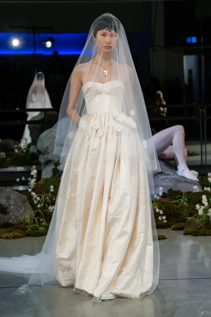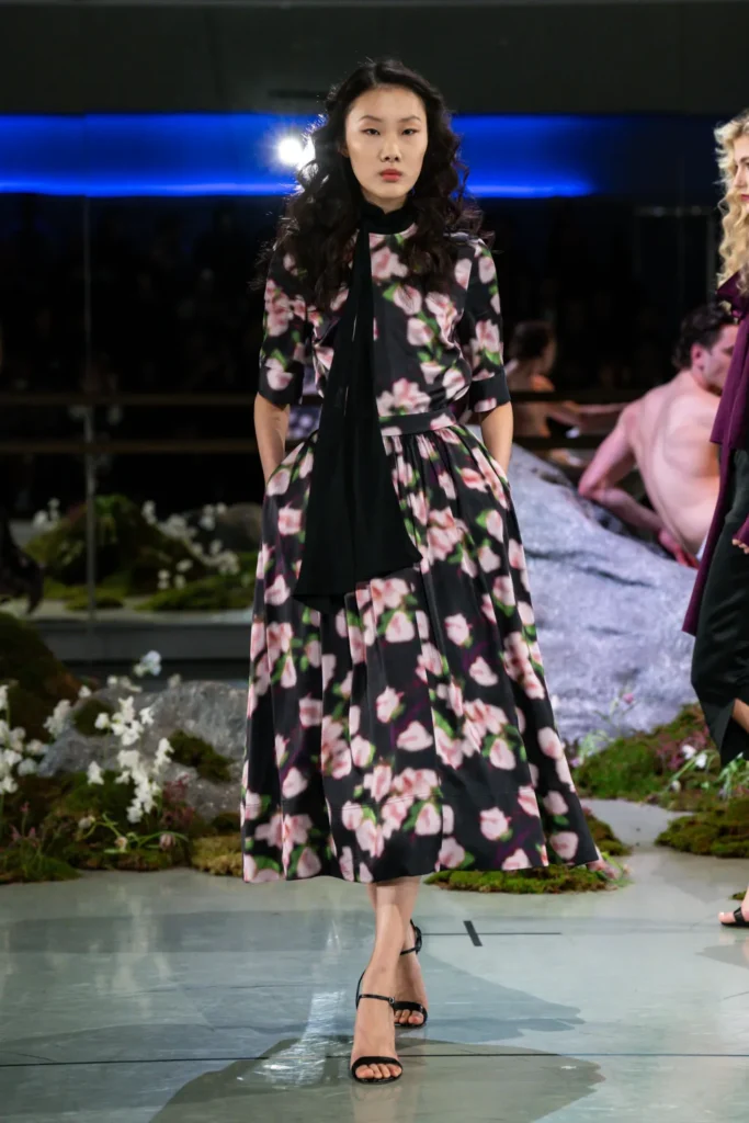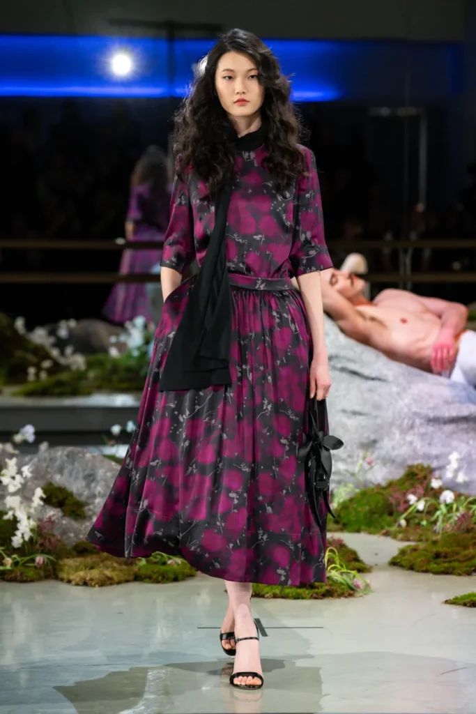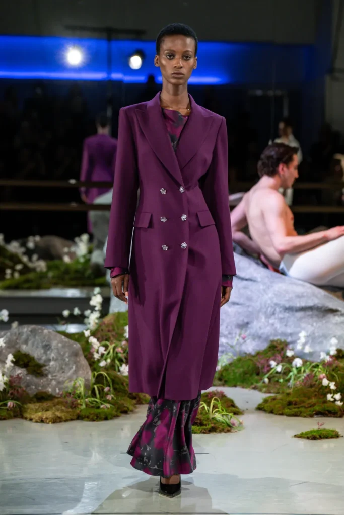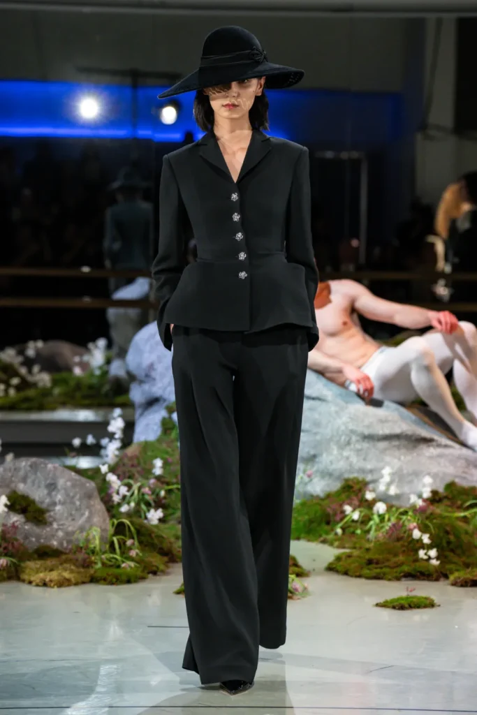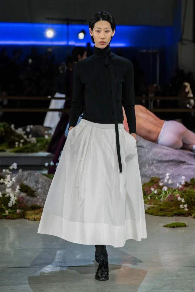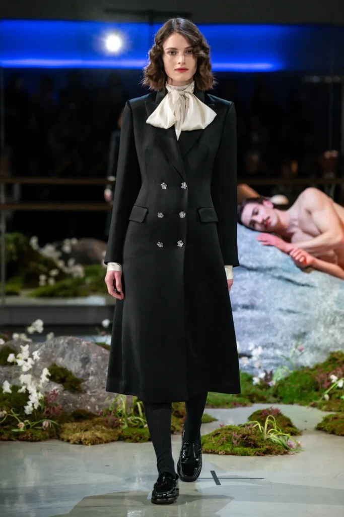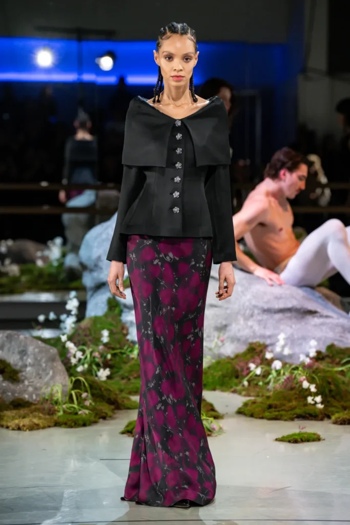McDowell pared back his signatures. Gone were exaggerated silhouettes and intricate embellishments. In their place: elongated tailoring with clean structure, a floral-embellished shirt dress, and a corseted evening gown washed in blurred purples and black. A double shawl-collar jacket stood out for its quiet authority, while the opening look—a sweeping white A-line skirt paired with a ribbed black knit—captured the collection’s balance of softness and strength.