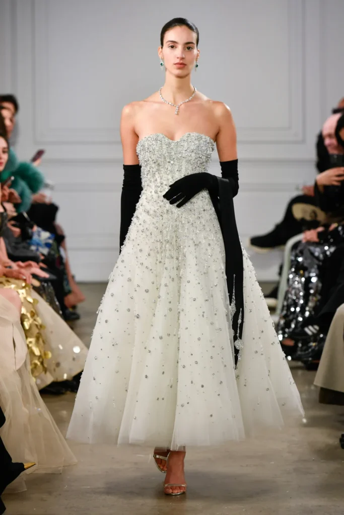 Silhouettes largely adhered to a Western couture archetype: tightly corseted bodices, opulent skirts, and frequent crinoline structures. Shorter looks carried a flirtatious edge, while longer gowns leaned conservative, favoring elegance over risk.