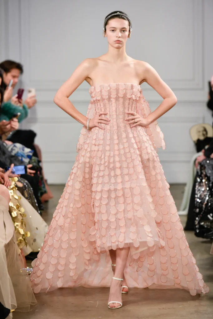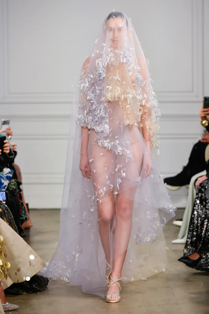 The collection was anchored in labor-intensive textiles. Tulle was structured with horsehair tubing to form fan-like stripes, while three-dimensional embroideries were built from individually applied sculptural loops. Organza dresses bloomed with 3D-cut leaves, each edged with tubular beads and meticulously stitched into place. A vivid red gown worn by Coco Rocha—alive with movement—reportedly took three months to complete.