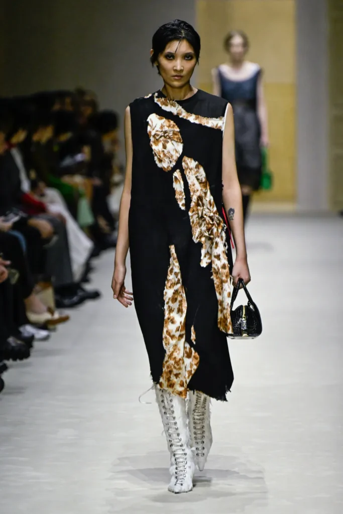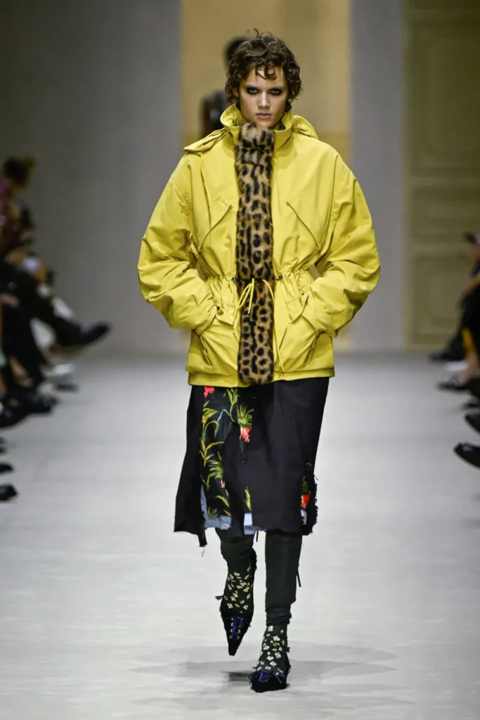 The collection embraced abrasion. Fabrics were frayed, distressed, purposefully soiled. Wrinkled shirts with exaggerated French cuffs dangled from the wrist. Crumpled trench coats split at the seams to expose plaid wool linings. Tubular overcoats—echoing the men’s Fall show—reappeared, alongside glossy utilitarian capes trimmed with vertical strips of animal-patterned fuzz. Corroded black wool on skirts and sheath dresses dissolved into blurred florals, a tension between decay and delicacy.