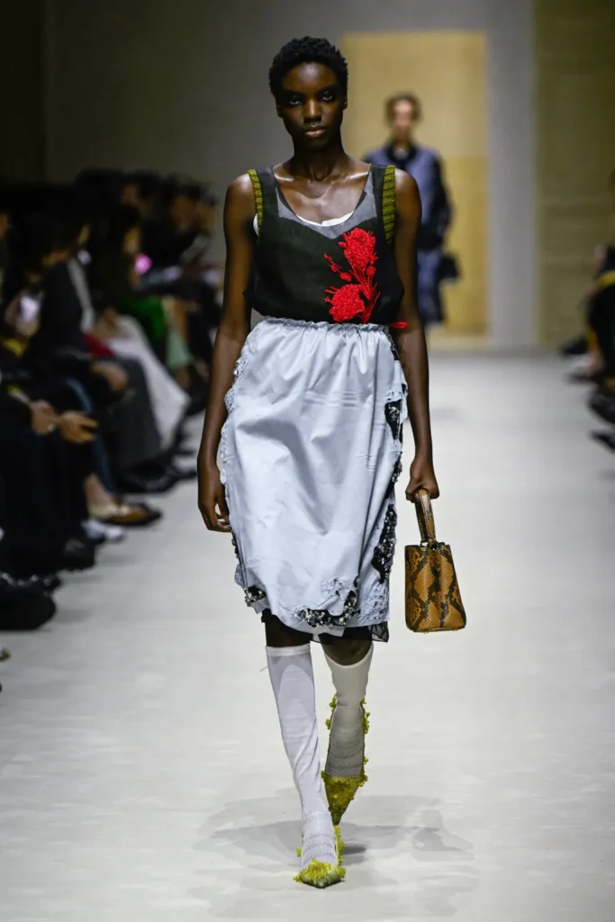 Against this studied imperfection came flashes of refinement: polished crocodile top-handle and bucket bags, towering lace-up boots edged in beads or engulfed in feathers. Luxury, here, was not erased but reframed.