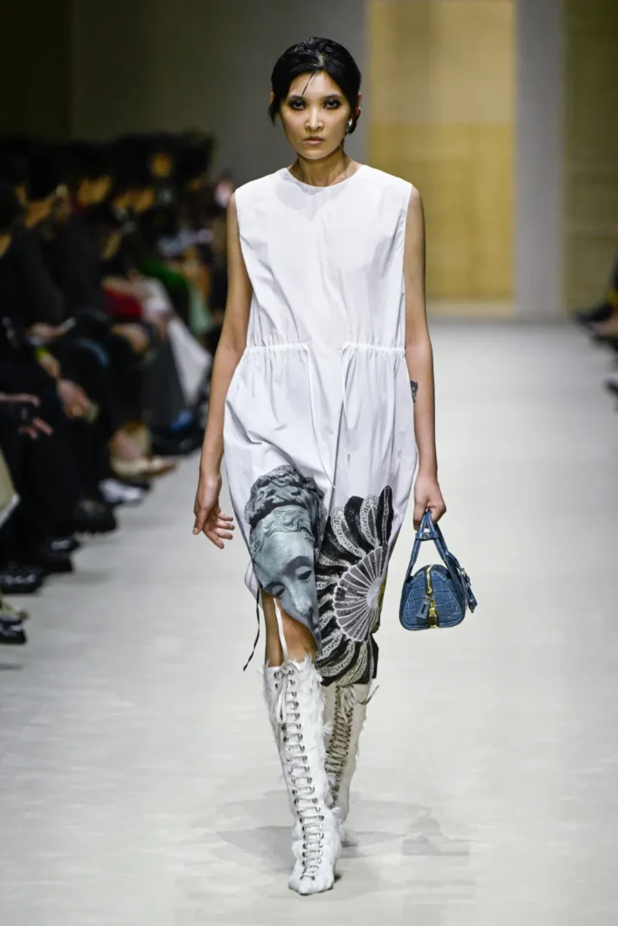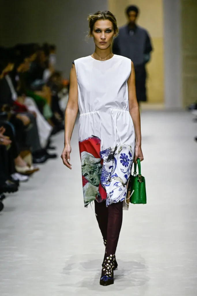 Set inside a space resembling a hollowed-out mansion—ornate moldings, marble fireplaces, colonial windows—the show underscored the theme of accumulation. Historical fragments, furniture, paintings: culture itself as layering. Prada described the process as an expression of “the constant need for change,” and how women negotiate that flux through dress. Simons rejected any hierarchy between minimal and opulent, pristine and distressed.