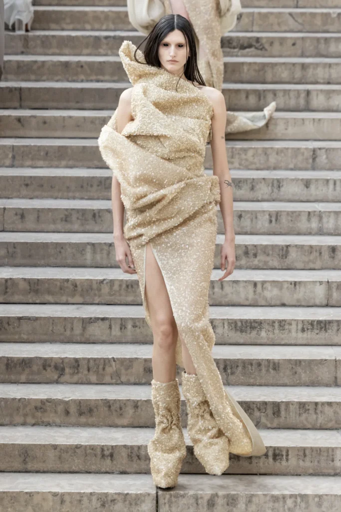 Rick Owens, the master of brutalist glamour, surprised Paris this season with a rare embrace of lingerie codes and sheer fabrics, creating one of his most unexpectedly beautiful collections in years. “I don’t usually work with delicate clothes, so I thought: let’s try that,” he said with his usual deadpan calm before the show, staged outdoors at the Palais de Tokyo.