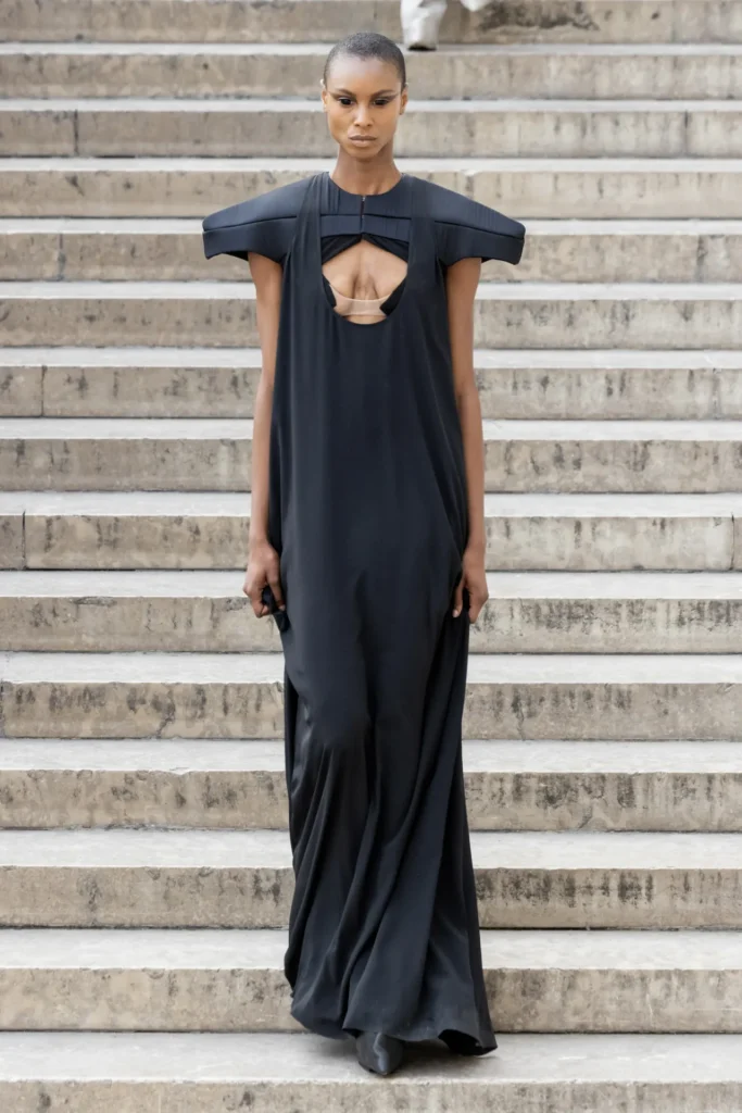Despite the subversion, old Hollywood glamour pulsed through the collection, even when filtered through bondage leather trousers or evening gowns of industrial nylon, described in the notes as “randomly arranged.” Highlights included low-cut slip dresses, micro trenchcoats trailing into tuxedo tails, airy long-sleeved bomber jackets, and cropped blouses with sharp Dracula collars. Each look carried Owens’ unmistakable dignity, heightened by his dark, sober palette and understated luxury materials.