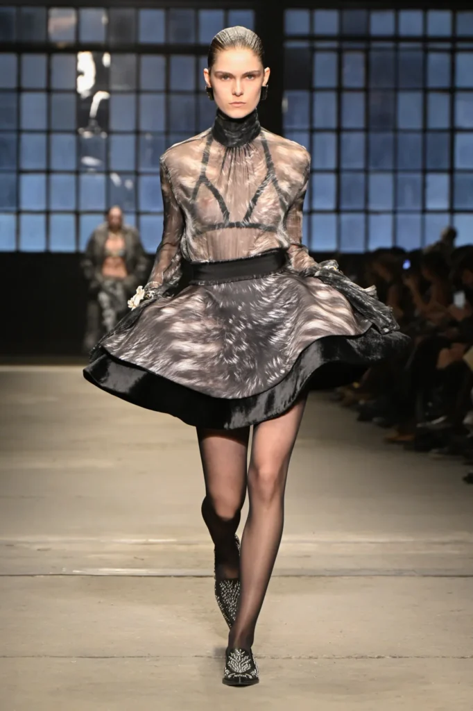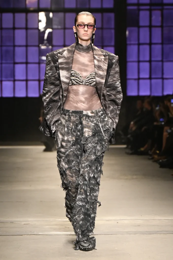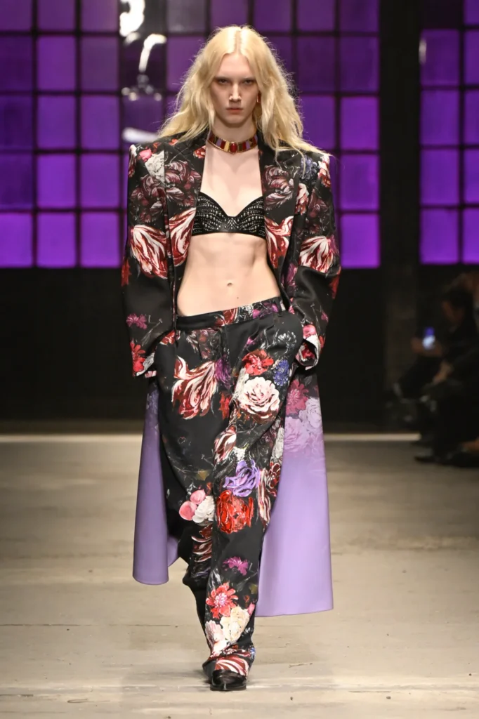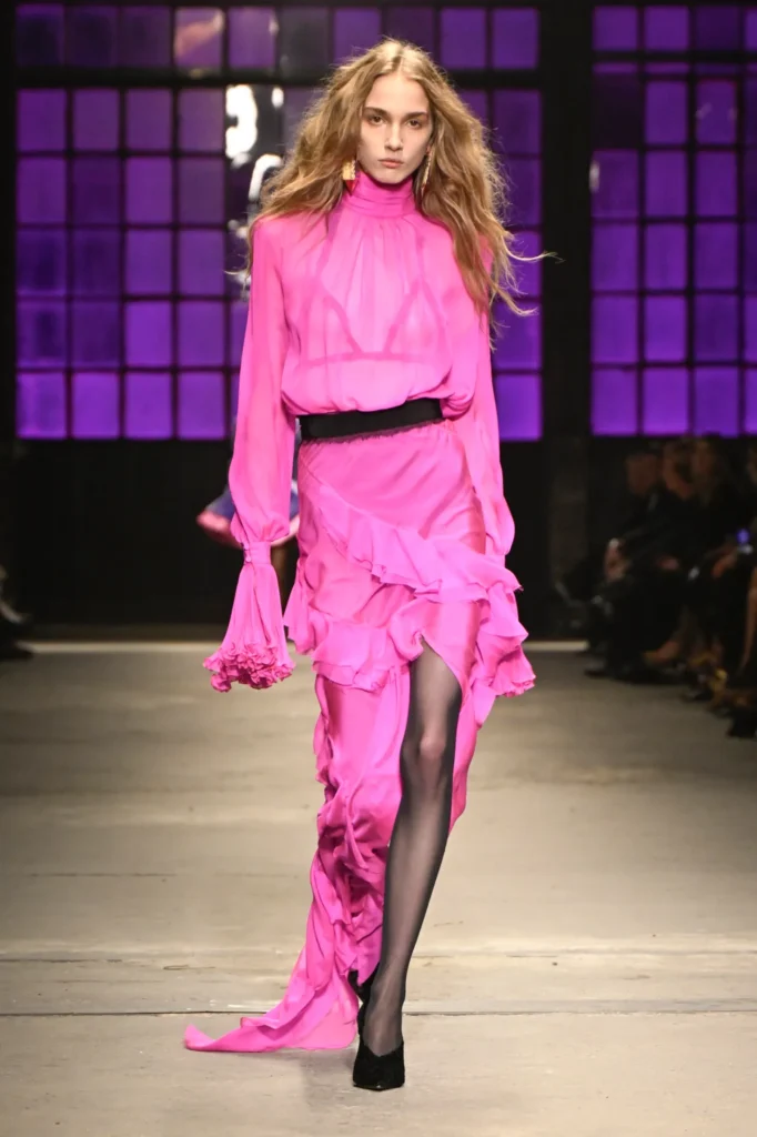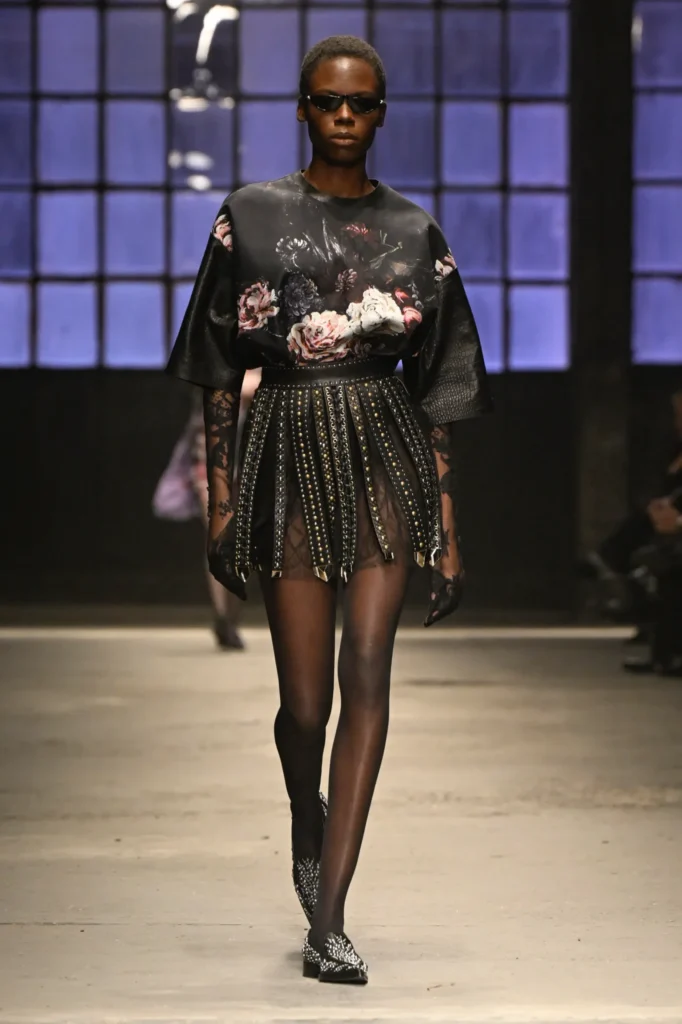 “I wanted something neo-romantic and dark,” Puglisi said backstage. “But festive, feminine, powerful.” It was less a retreat than a recalibration: Cavalli’s signature opulence refracted through shadow.