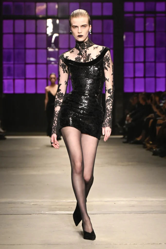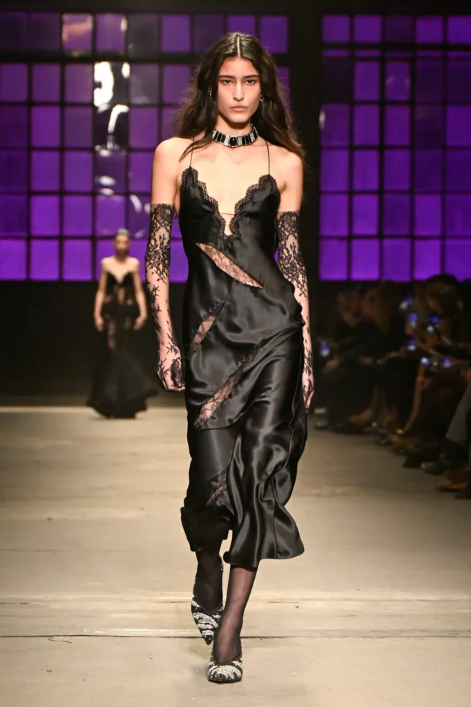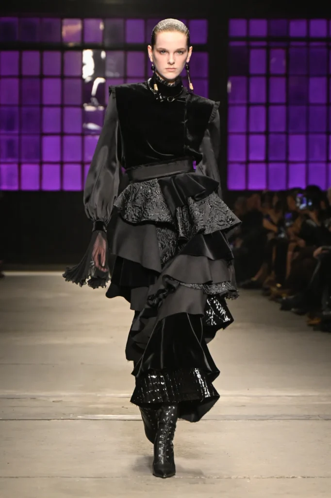 Black arrived in layers and textures rather than flat statements. Cropped biker jackets embossed in crocodile; sweeping, high-shine trousers; ballerina skirts with dramatic volume; and tiered dresses spliced from contrasting fabrics established a tactile richness. Lace played a central role—cross-back slips, sheer minis, and corset-short sequined dresses with lace sleeves sharpened the mood. Silk gowns with elongated, pleated sleeves that pooled over the hands evoked a sleek, modern Morticia: theatrical but controlled.
