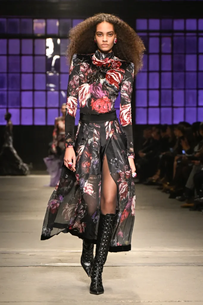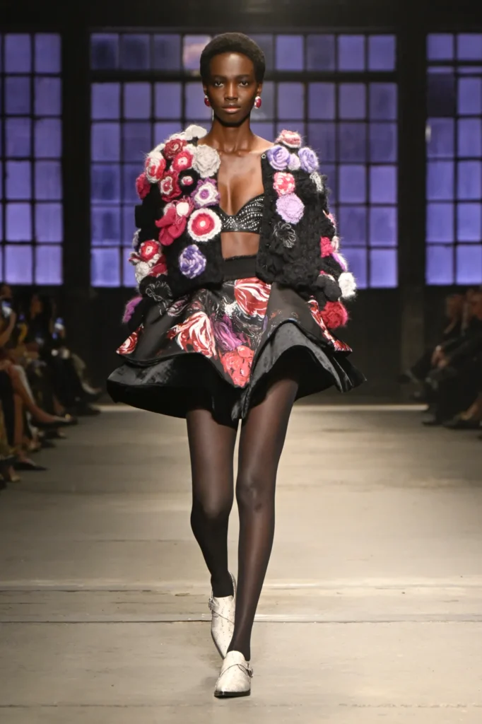 When color finally emerged, it punctured the darkness with intent. Sheer gowns printed with painterly roses, sculpted shoulders, and hues borrowed from Old Master canvases reintroduced romantic drama. Knitwear bloomed with plush rosettes; a rose-embroidered mini flashed with sequins. Later, saturated silk dresses in vivid pink and violet jolted the palette, restoring the brand’s instinct for spectacle.