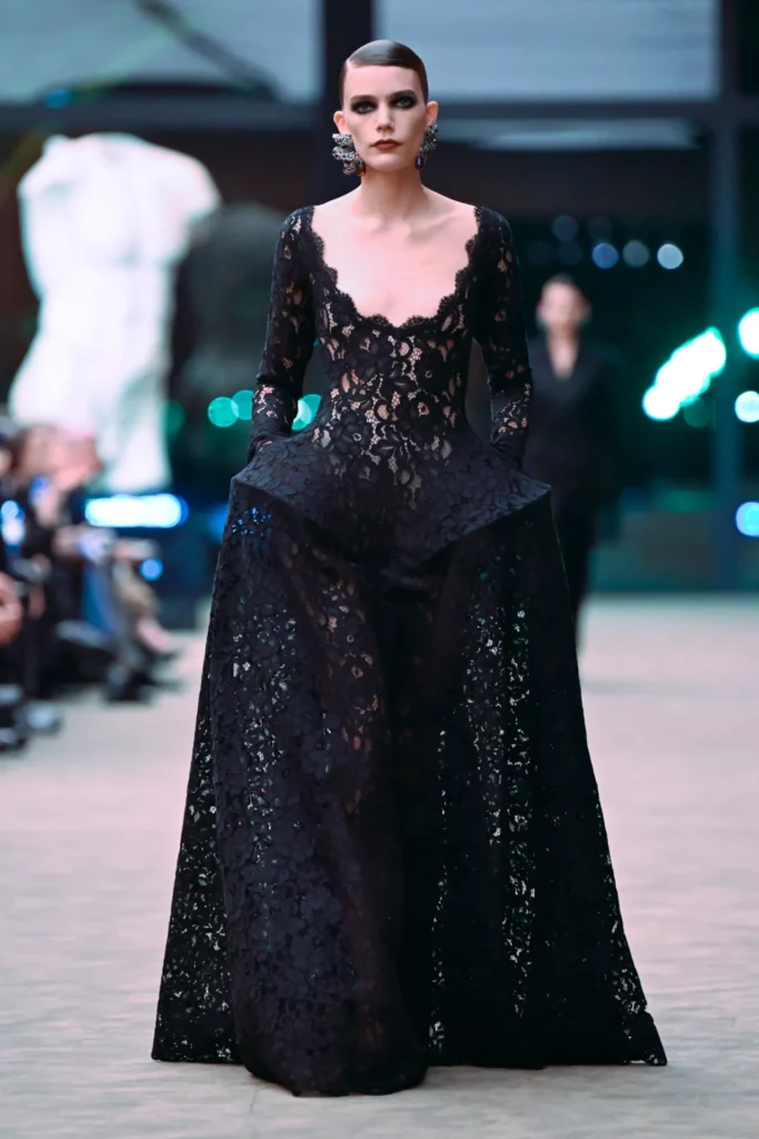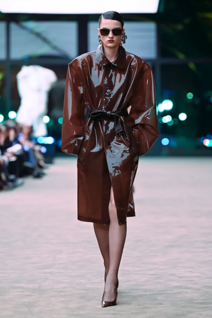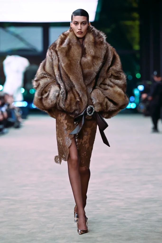 The setting—a vast, glass-walled structure reminiscent of a modernist villa—heightened the austerity. Grooming was severe: sleek chignons, smoky eyes, substantial gold jewelry, including oversized dove earrings. Vaccarello’s long-snouted slingbacks sharpened every step.