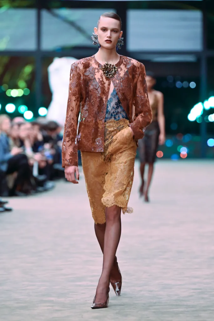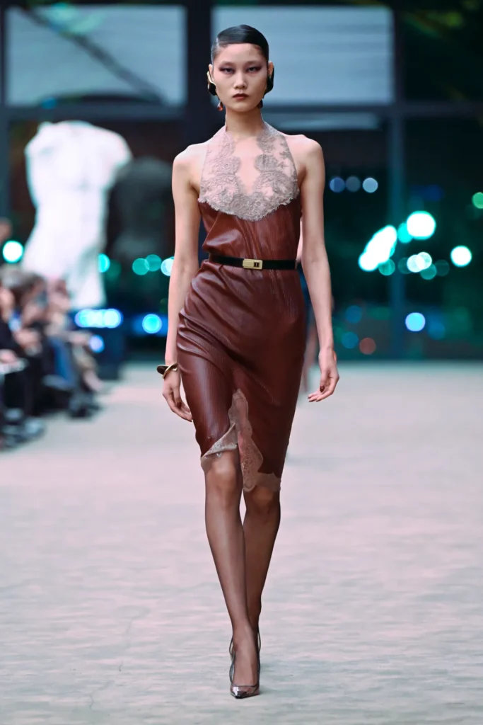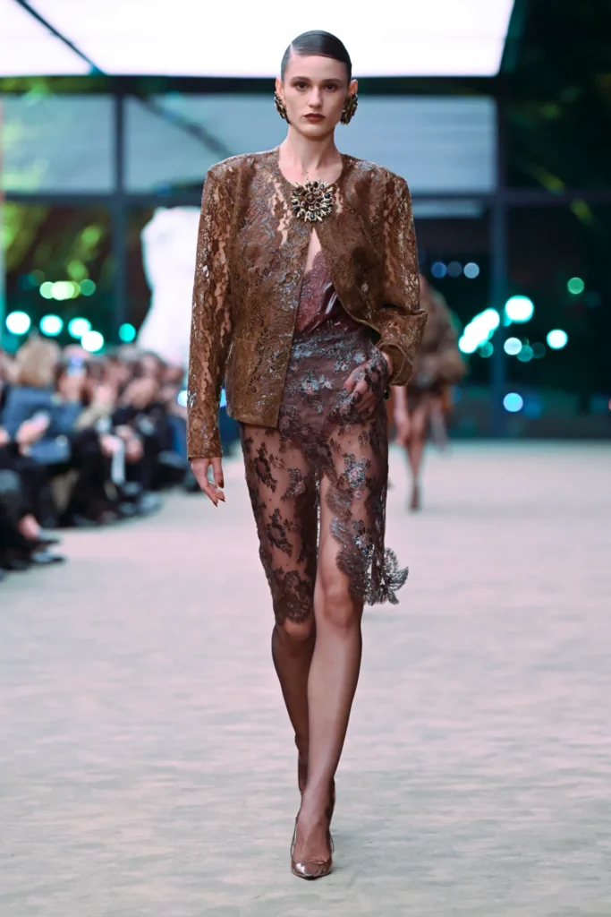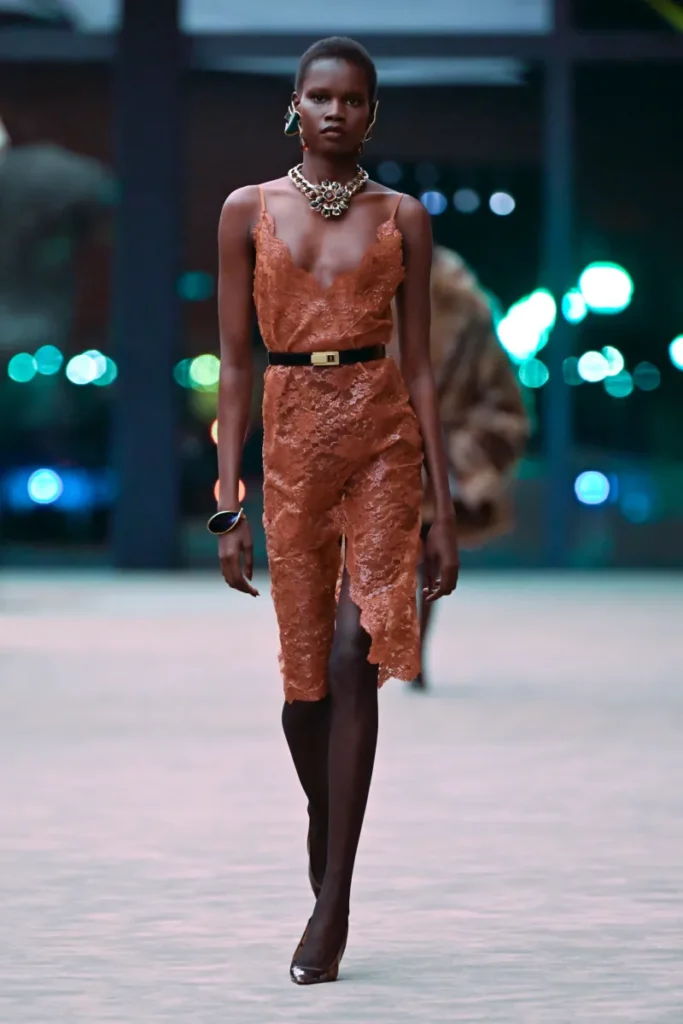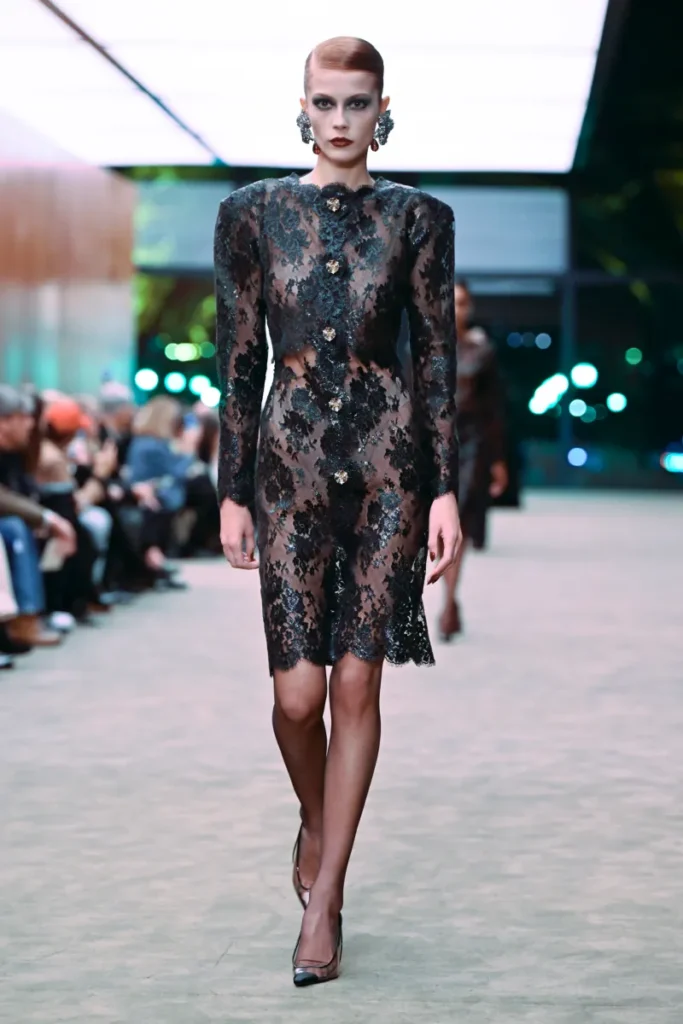 Structure extended beyond suiting. Lace was stiffened with latex, transformed into cardigan jackets and straight skirts that balanced fragility with discipline. Slip dresses in house-coded color pairings delivered quiet seduction, while the air itself was laced with Opium, the brand’s emblematic fragrance, underscoring the mood.
