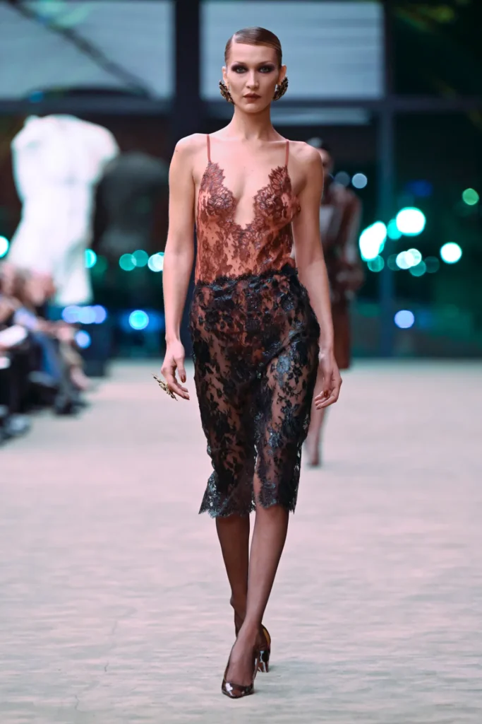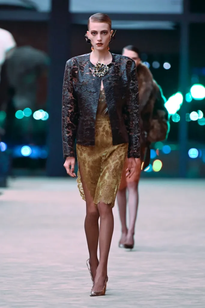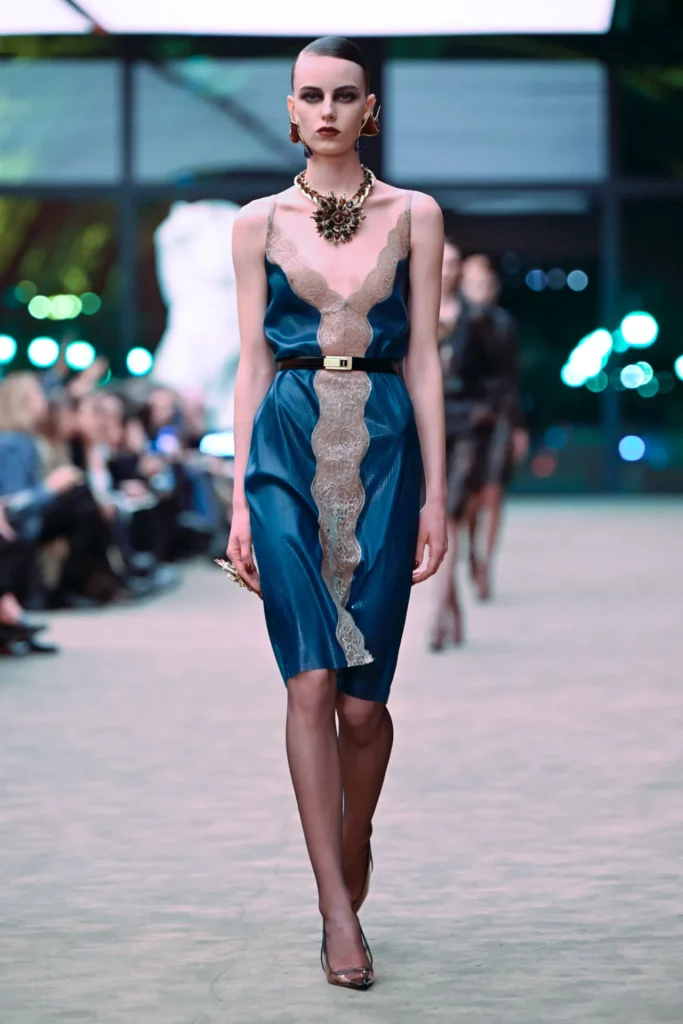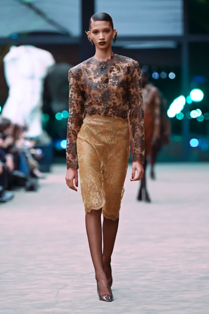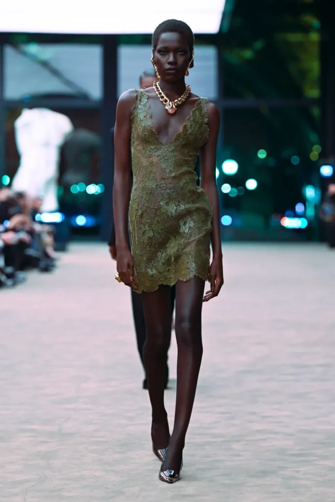 Structure extended beyond suiting. Lace was stiffened with latex, transformed into cardigan jackets and straight skirts that balanced fragility with discipline. Slip dresses in house-coded color pairings delivered quiet seduction, while the air itself was laced with Opium, the brand’s emblematic fragrance, underscoring the mood.