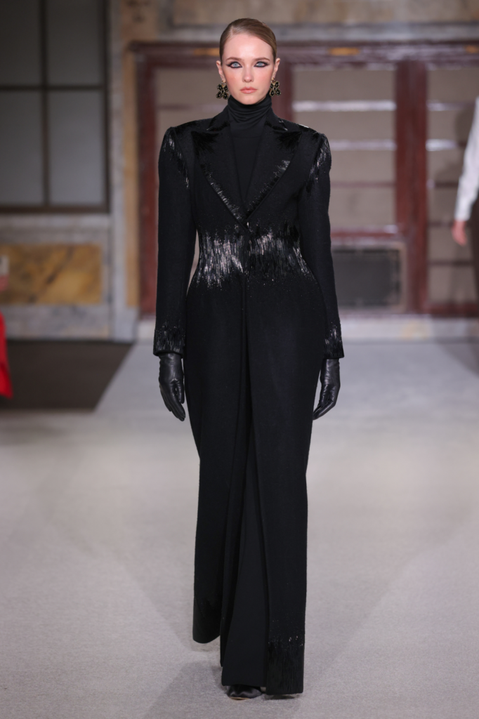 That narrative translated into strong-shouldered suiting—Hudson’s calling card—cut with surgical precision. Eveningwear shimmered in saturated velvet and liquid sequins, sculpted close to the body. The silhouettes were bold yet controlled, favoring clean lines over excess embellishment. Even at its most glamorous, the collection felt edited.