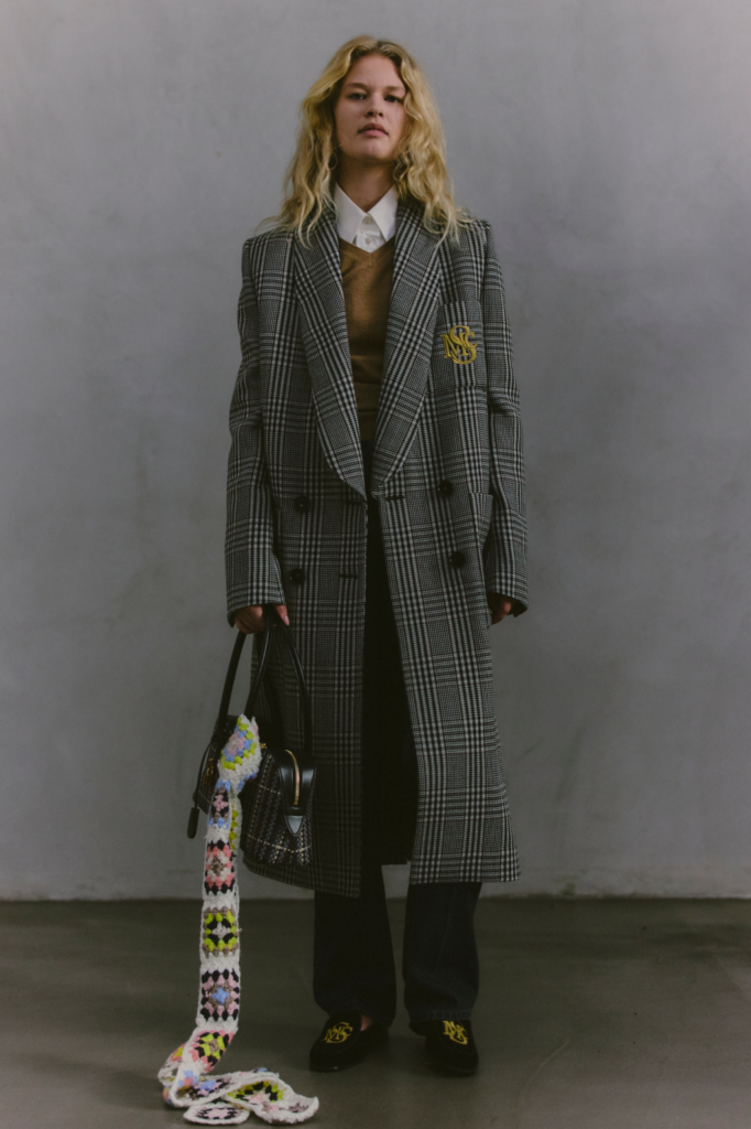 The collection’s structure leans into sculpted tailoring: broad-shouldered jackets with cinched waists, elongated vests, double-breasted outerwear, and wide-leg pleated trousers cut from responsibly sourced wool. Many pieces carry the season’s “SMC” crest embroidered in gold thread, adapted from a pair of Paul McCartney’s vintage sneakers. Evening-leaning tailoring—tuxedo jackets, coats, and sharply cut separates—arrives hand-finished with lead-free crystals for a clean, modern shimmer.