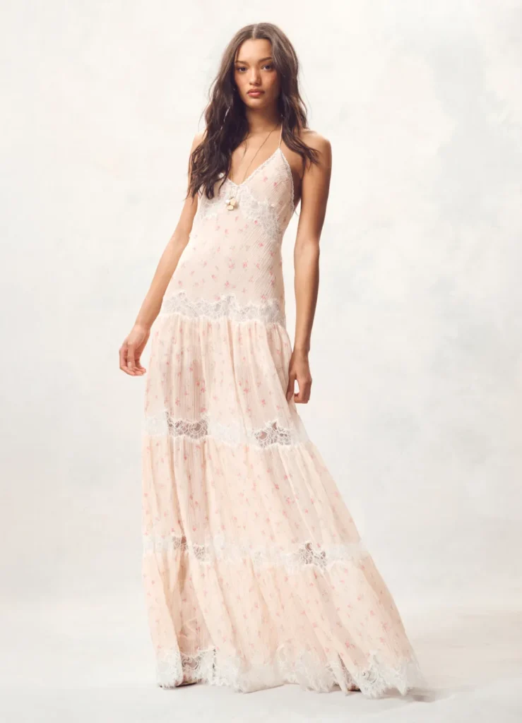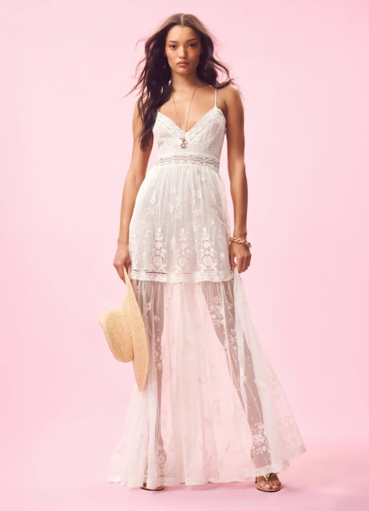 Dresses remain the emotional core of the collection. Cohen leans into embroidery and her beloved shades of pink, revisiting the original LoveShackFancy bridesmaid dress with fresh energy. Bias-cut slip dresses nod to 1930s lingerie, while Malibu-at-sunset Barbie fantasy meets Ibiza nightlife in floaty, flirtatious styles designed for travel and transformation.
