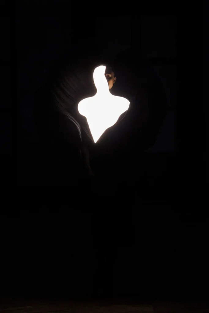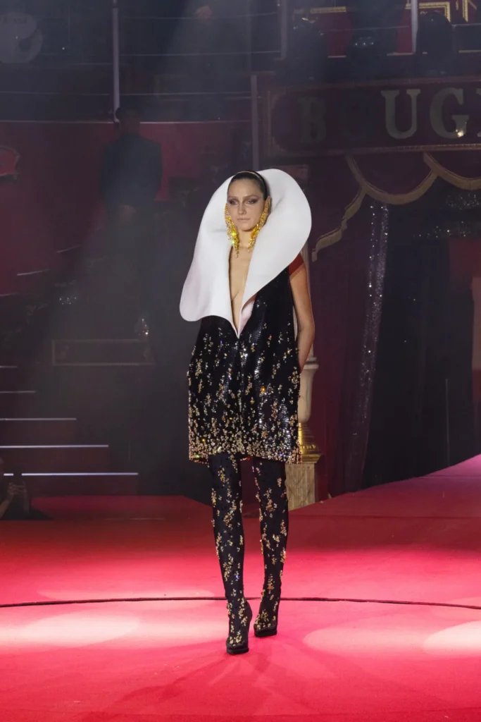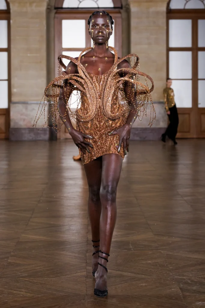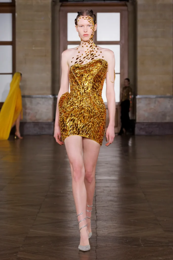 The finale was otherworldly. A dress composed of thousands of resin elements shimmered in shifting hues reminiscent of deep-space photography. With her face and hair painted to match, the model appeared less human than celestial—an embodiment of the universe itself.