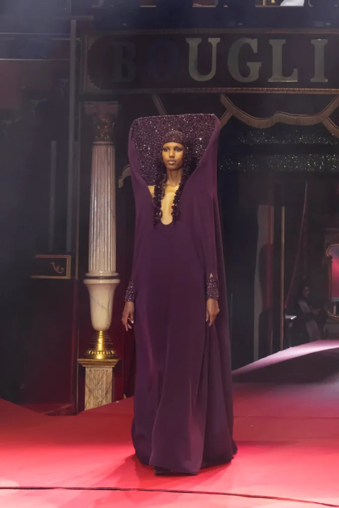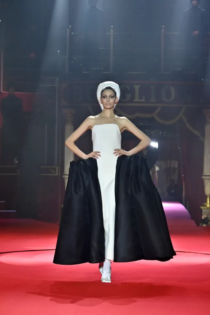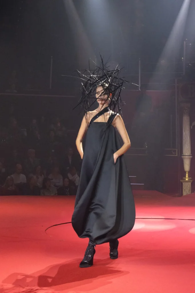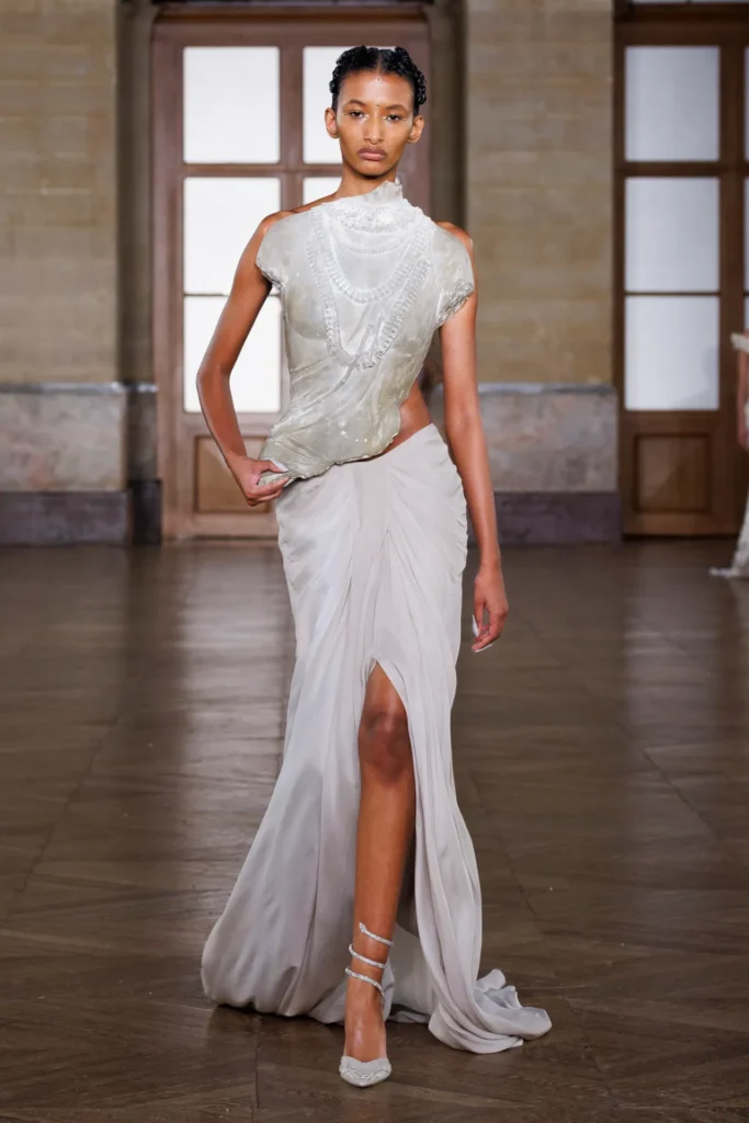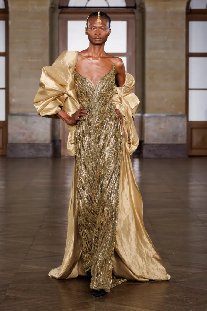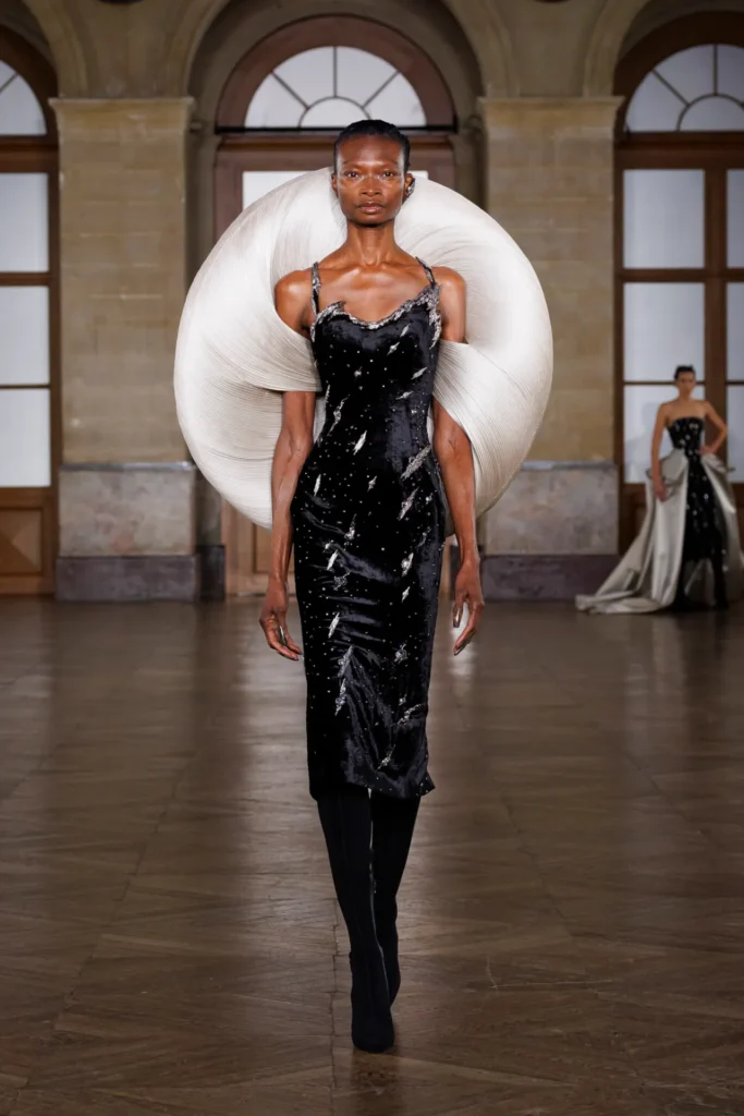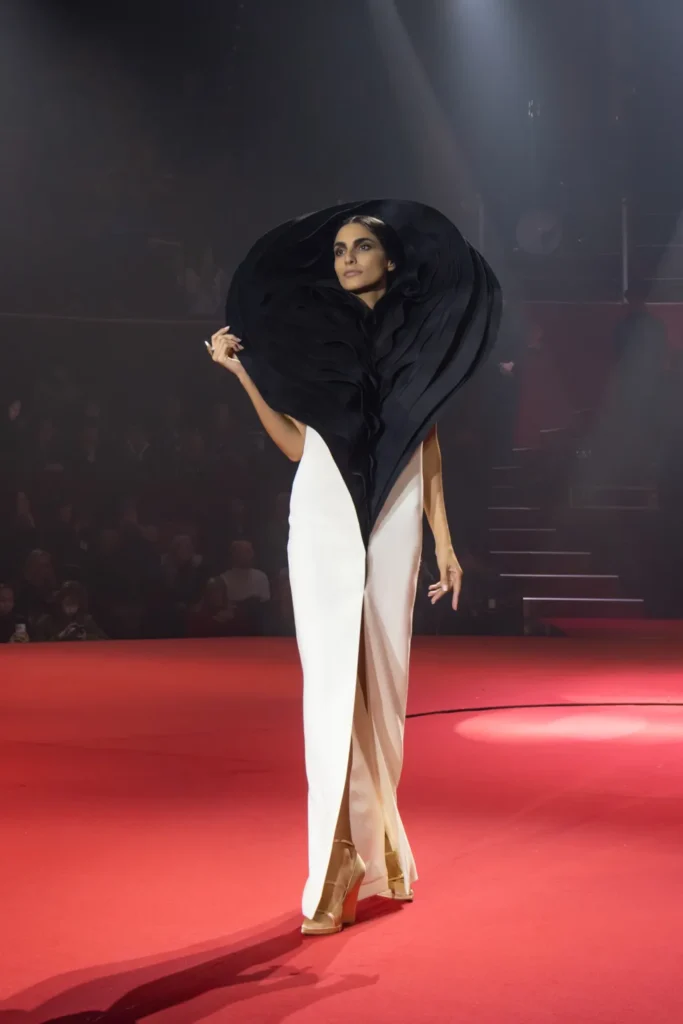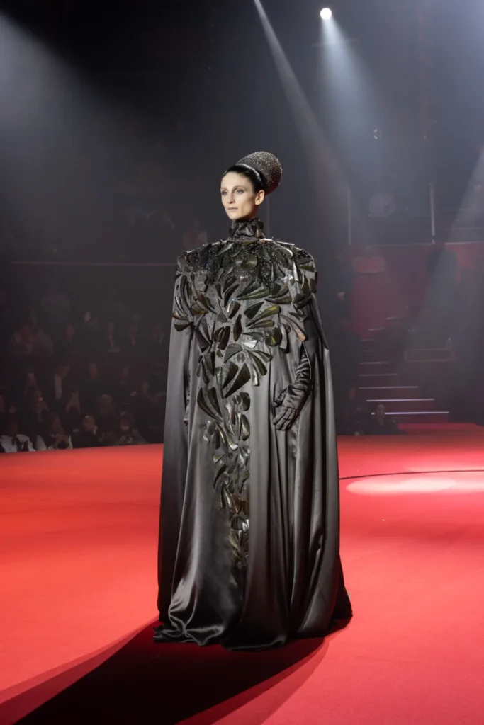 From there, the collection traced a cosmic arc. The birth of the universe appeared in all-black looks streaked with star-dust embroidery, evoking the Big Bang. The emergence of life followed: a white column gown swirling like a floral vortex; another textured with reptilian scales. Spiritual awakening arrived in the form of a replicated Indian temple sculpture, perched atop a deceptively simple draped skirt.